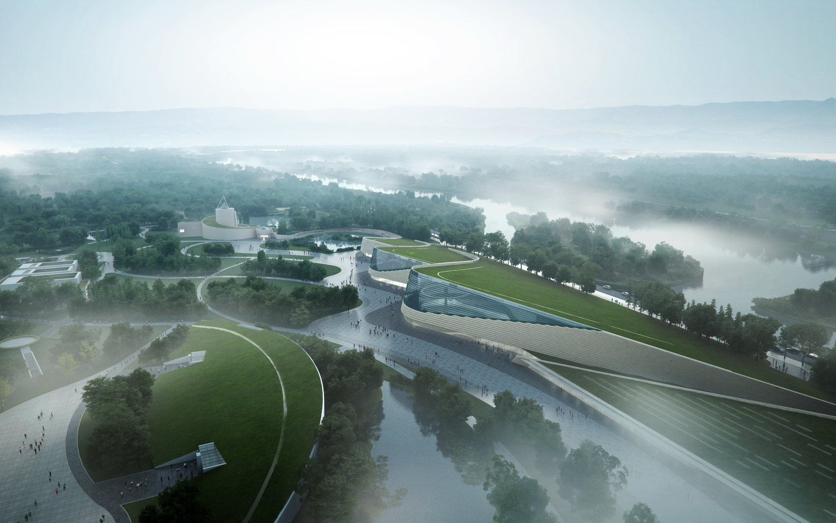 设计取意“堆列三星,古蜀之眼”,青铜面具通过极富表现力的眼睛,仿佛在与观众进行一场穿越时空的对话。我们设计的“古蜀之眼”——新馆外立面上两个巨大的玻璃窗口,就像三星堆青铜面具中的眼睛一样成为视线交流的核心。同时我们将老馆经典的螺旋曲线外墙延续展开,作为新馆外形和内部空间的控制曲线。建筑屋顶倾斜延伸,消隐融入场地,与原有一号馆形体左右呼应,建筑形成三个沿中轴排列的覆土堆体——寓意“堆列三星”。