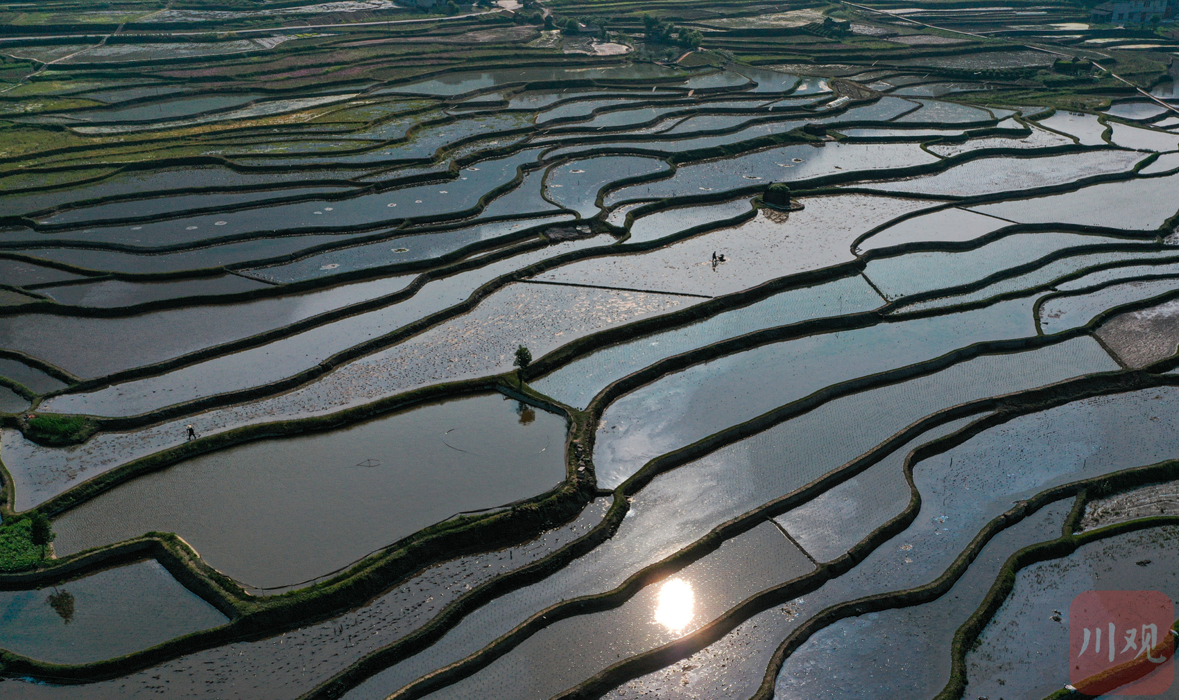 进入春耕时节后,红岩村蓄满了水的万亩梯田层层叠叠,被田垄分割成一块块或宽或窄,或大或小,自然延伸的农田。从天空俯瞰,宛若一幅幅水墨山水画。