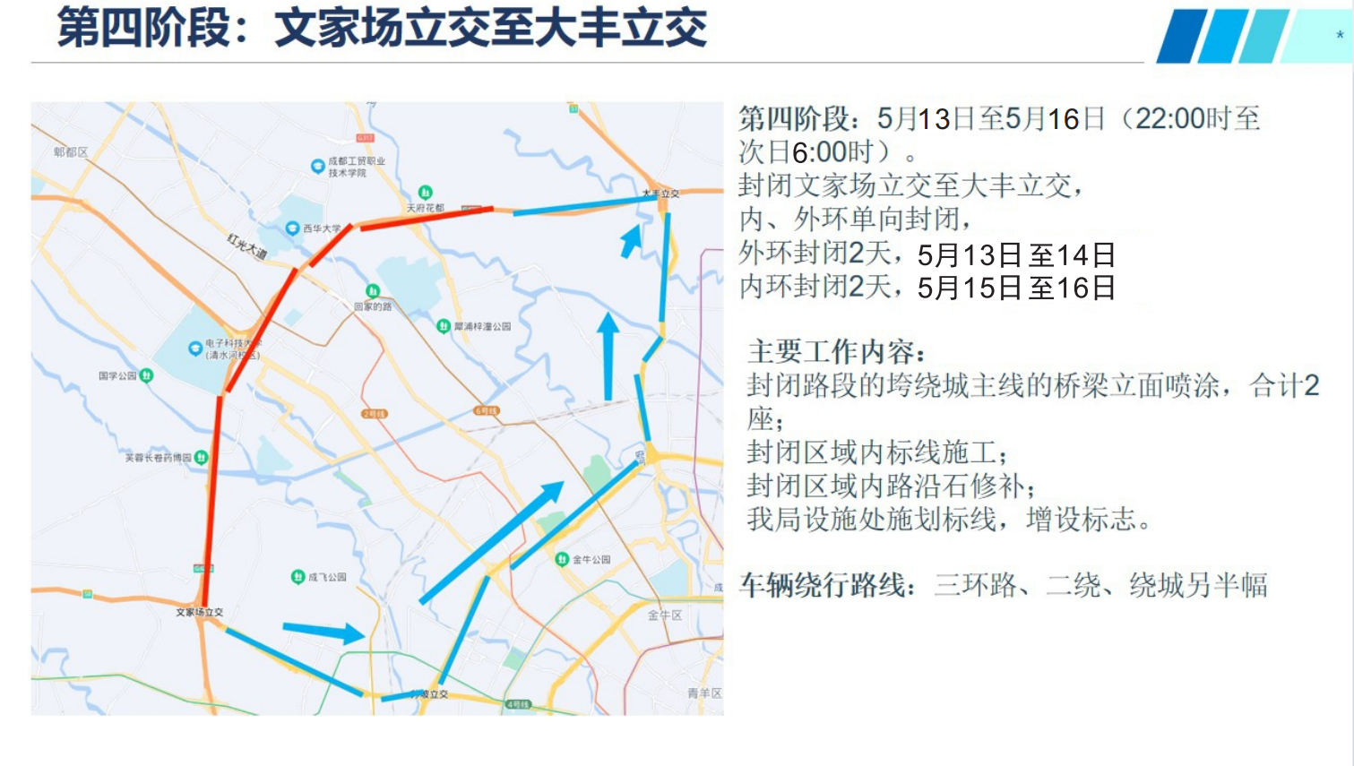 四、2022年5月13日至5月14日的每日22:00至次日6:00,成都绕城高速(G4202)大丰立交至文家场立交的高速路段外环封闭施工,禁止机动车通行;2022年5月15日至5月16日的每日22:00至次日6:00,成都绕城高速(G4202)文家场立交至大丰立交的高速路段内环封闭施工,禁止机动车通行。在此期间,永宁收费站、成灌收费站、蜀源大道收费站、大丰立交、绕西服务区通往绕城高速施工路段的匝道同步封闭。