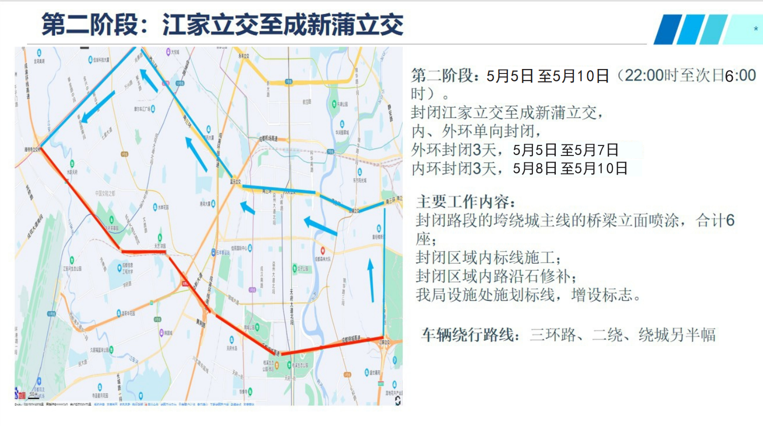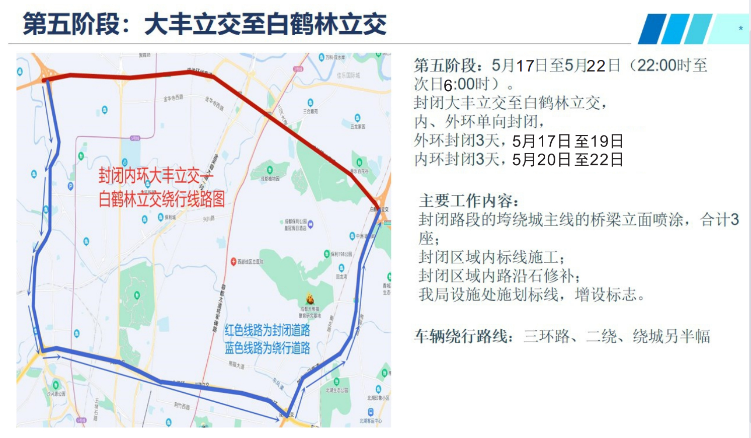 五、2022年5月17日至5月19日的每日22:00至次日6:00,成都绕城高速(G4202)白鹤林立交至大丰立交的高速路段外环封闭施工,禁止机动车通行;2022年5月20日至5月22日的每日22:00至次日6:00,成都绕城高速(G4202)大丰立交至白鹤林立交的高速路段内环封闭施工,禁止机动车通行。在此期间,大丰立交、北新收费站、货运大道收费站、三河场收费站、白鹤林立交通往绕城高速施工路段的匝道同步封闭。