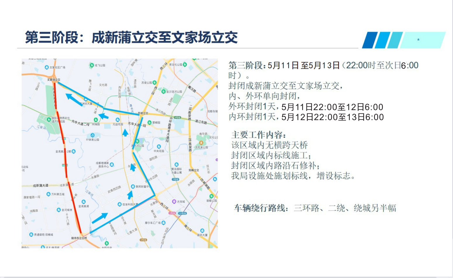 三、2022年5月11日22:00至5月12日6:00,成都绕城高速(G4202)文家场立交至成新蒲立交的高速路段外环封闭施工,禁止机动车通行;2022年5月12日22:00至5月13日6:00,成都绕城高速(G4202)成新蒲立交至文家场立交的高速路段内环封闭施工,禁止机动车通行。在此期间成新蒲立交、绿舟立交、文家场收费站通往绕城高速施工路段的匝道同步封闭。