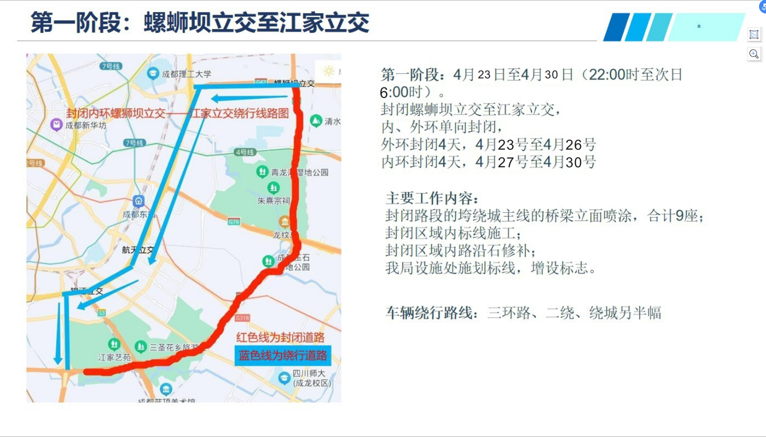 一、2022年4月23日至4月26日的每日22:00至次日6:00,成都绕城高速(G4202)江家立交至螺丝坝立交的高速公路段外环封闭施工,禁止机动车通行。4月27日至4月30日的每日22:00至次日6:00,成都绕城高速(G4202)螺丝坝立交至江家立交的高速公路段内环封闭施工,禁止机动车通行。在此期间,沪蓉高速(G42)成南高速段、渝蓉高速(G5013)成安渝高速段、成龙收费站、成资渝高速(S3)天府国际机场高速段、蓉遵高速(G4215)、绕东服务区的通往绕城高速施工路段的匝道同步封闭。