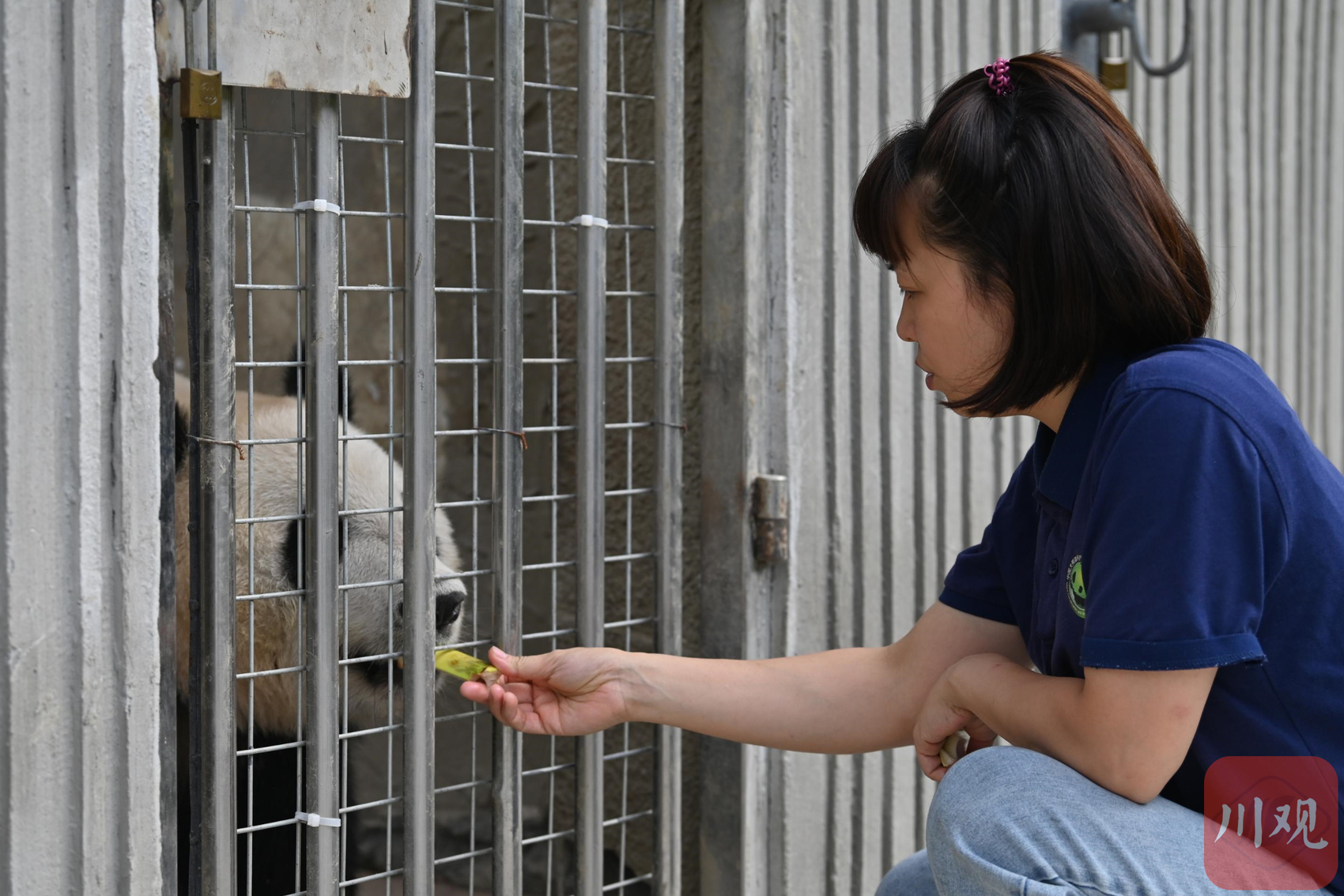 基地饲养员郎舜筠给大熊猫“盼月”喂竹笋。