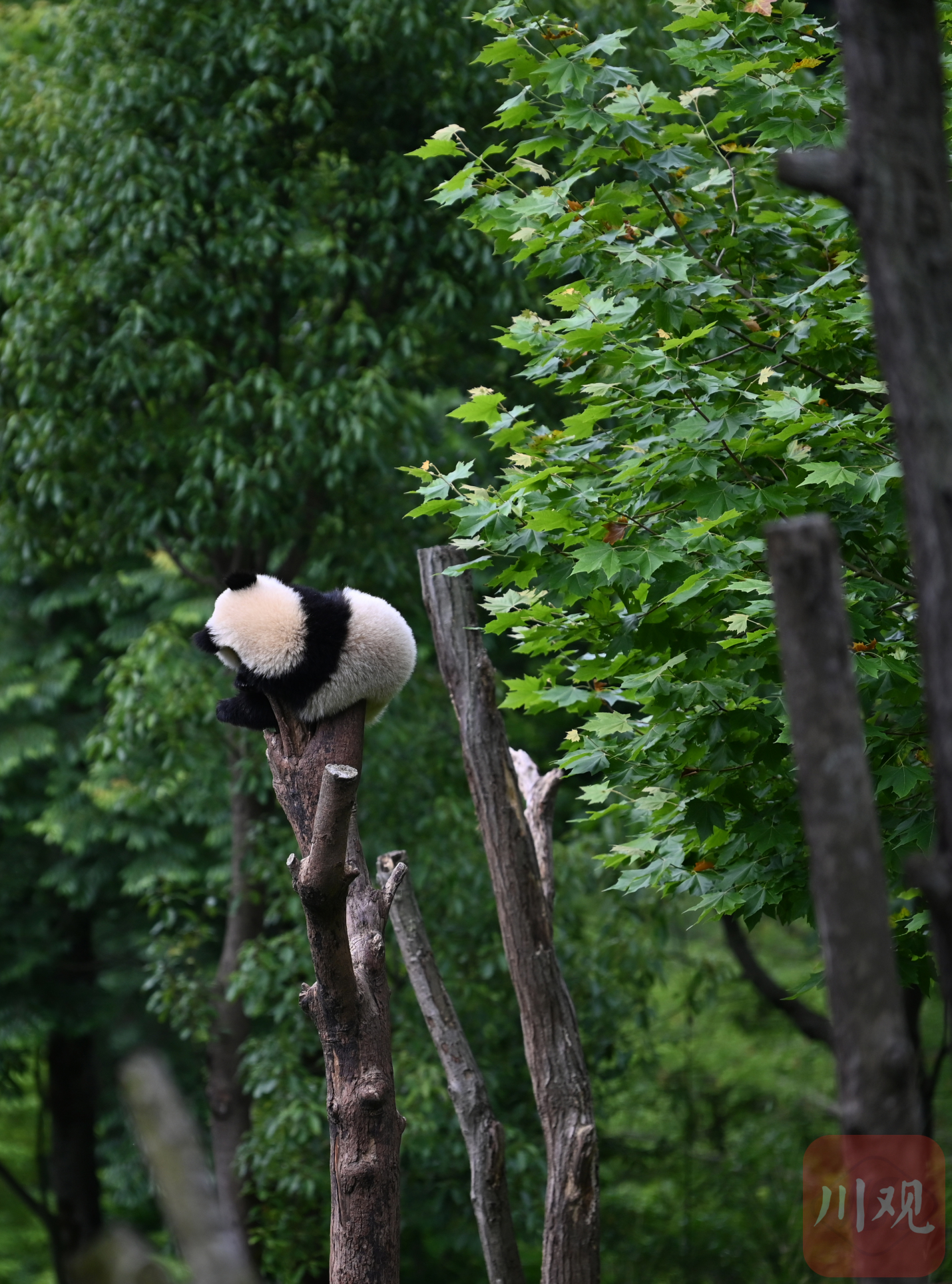 6月30日,阿坝州汶川县卧龙自然保护区内的中国大熊猫保护研究中心卧龙神树坪基地,大熊猫们正在树上睡觉,憨态的睡姿吸引游客久久驻足观看。基地被绿树包围,具有藏羌风格圈舍隐约其中。在基地大门的巨石上,雕刻有中心标志和紫荆花图案,告诉游客因大熊猫与四川结下深厚情谊的香港,援建了中国大熊猫保护研究中心卧龙神树坪基地。