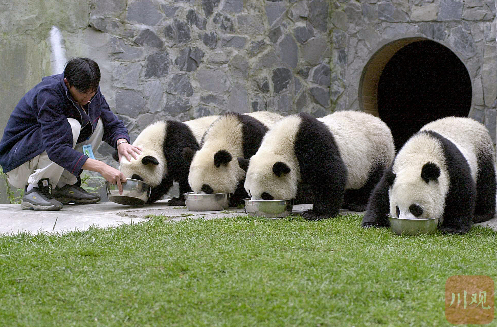 2007年1月,大熊猫“盈盈”(左二)在核桃坪基地喝奶。