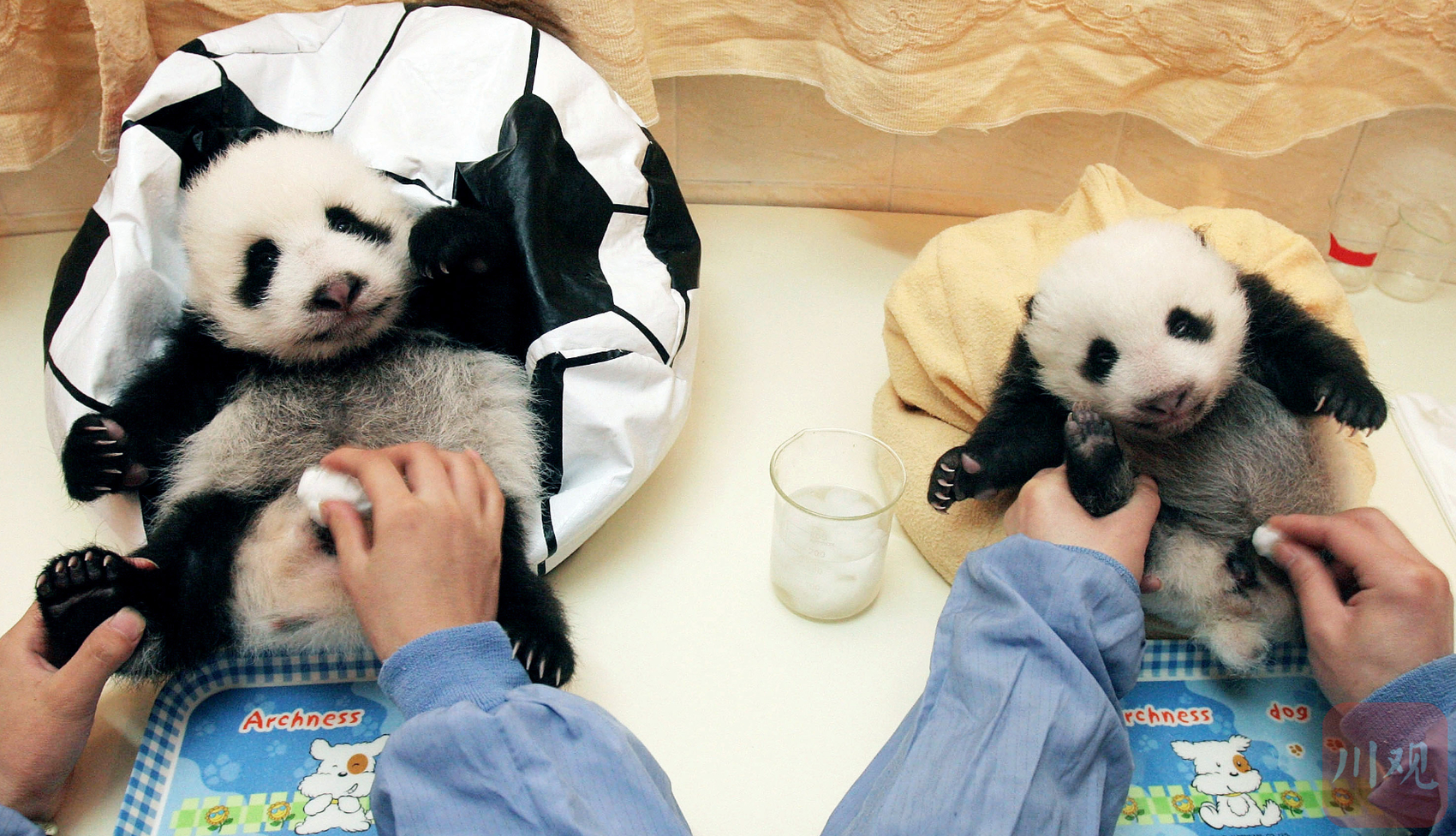 2005年10月,大熊猫育幼员照顾“乐乐”(右)。