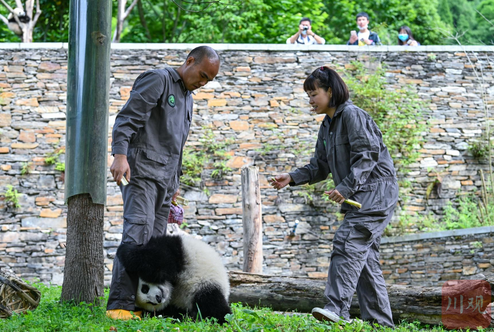 结缘的不只川港两地,基地内的一对夫妇也是因为大熊猫结缘,香港土生土长的姑娘郎舜筠与基地动物管理部部长董超走到了一起。2018年,郎舜筠嫁到了卧龙,成为四川媳妇,并成为基地一名饲养员,现在一家三口生活得幸福美满。
