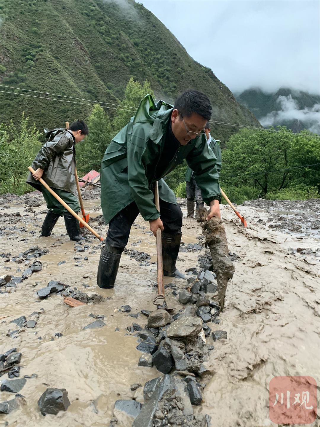 灾后,罗从兵和群众一起修整道路。(金川县融媒体中心供图)