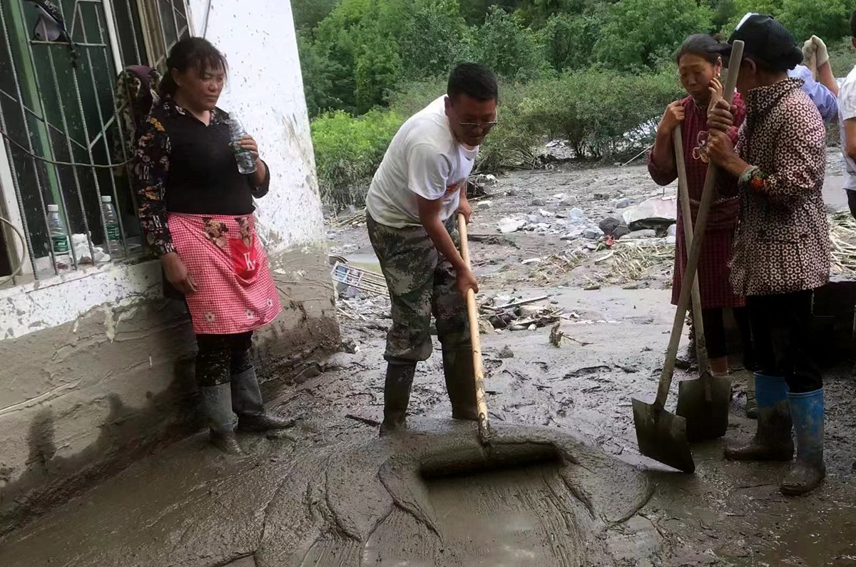 罗从兵(中)和群众一起清理受泥石流影响的街道。(金川县融媒体中心供图)