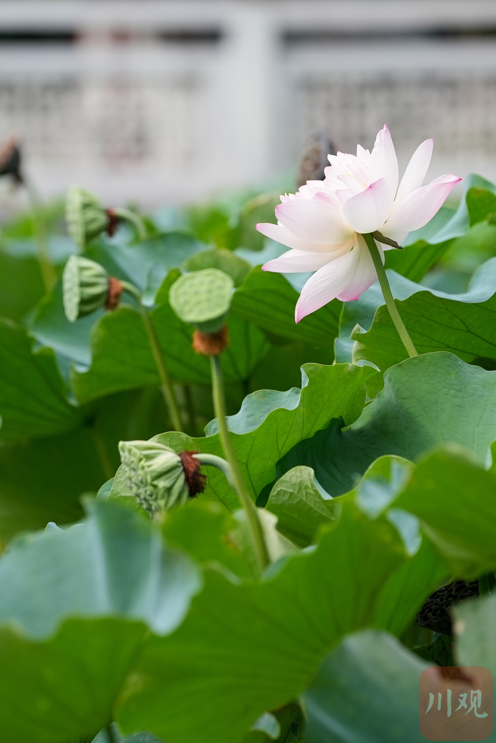 7月14日,川观新闻记者来到成都文化公园,径直走入公园大门,一眼便能看到荷花池,翠绿硕大的叶片将池塘遮盖,粉白相间的荷花也点缀其中,亭前槛外,亭亭玉立、姿态万千。即使是炽热的夏日,来到这里赏荷花的市民也不少,都拿着手机拍个不停。