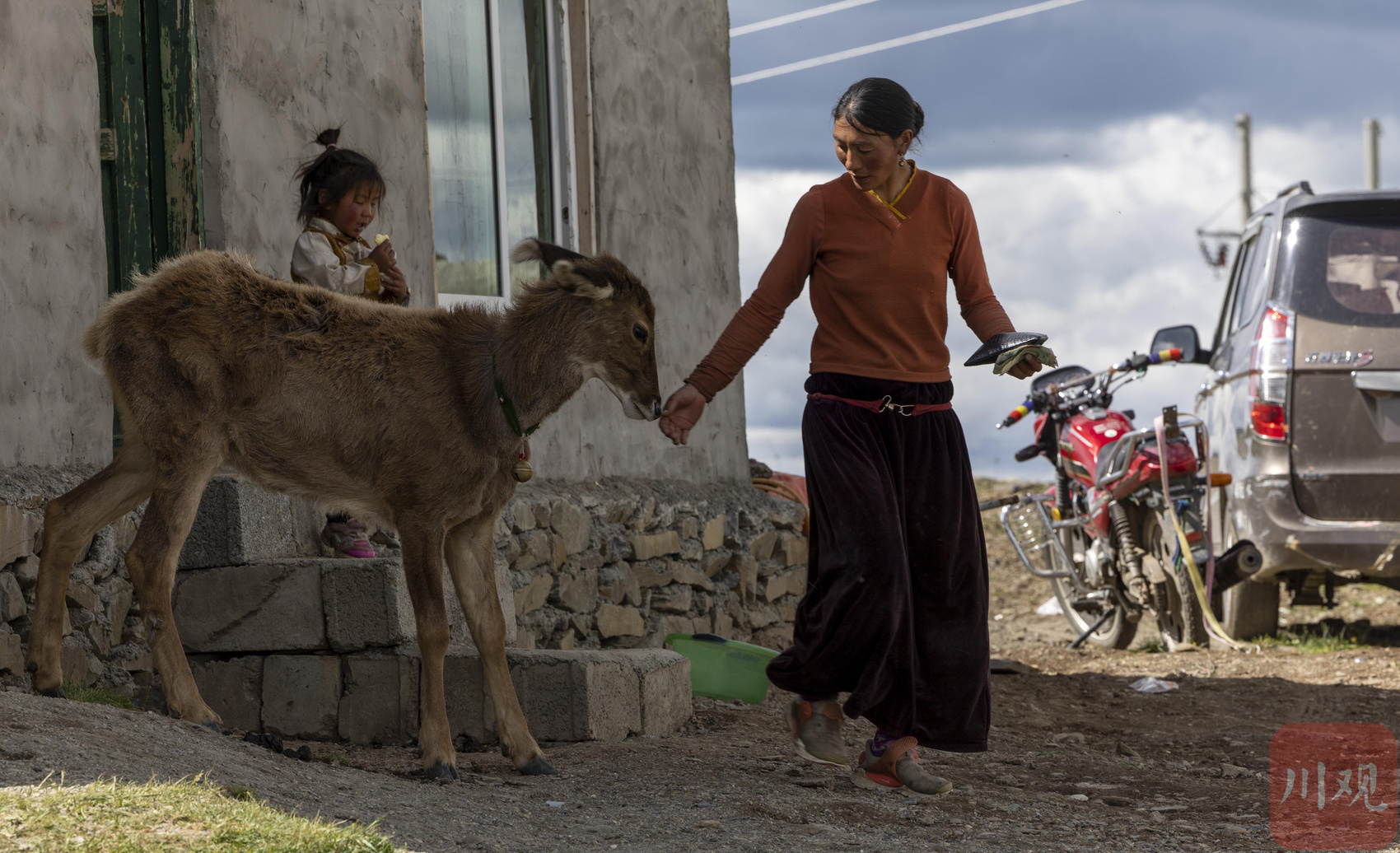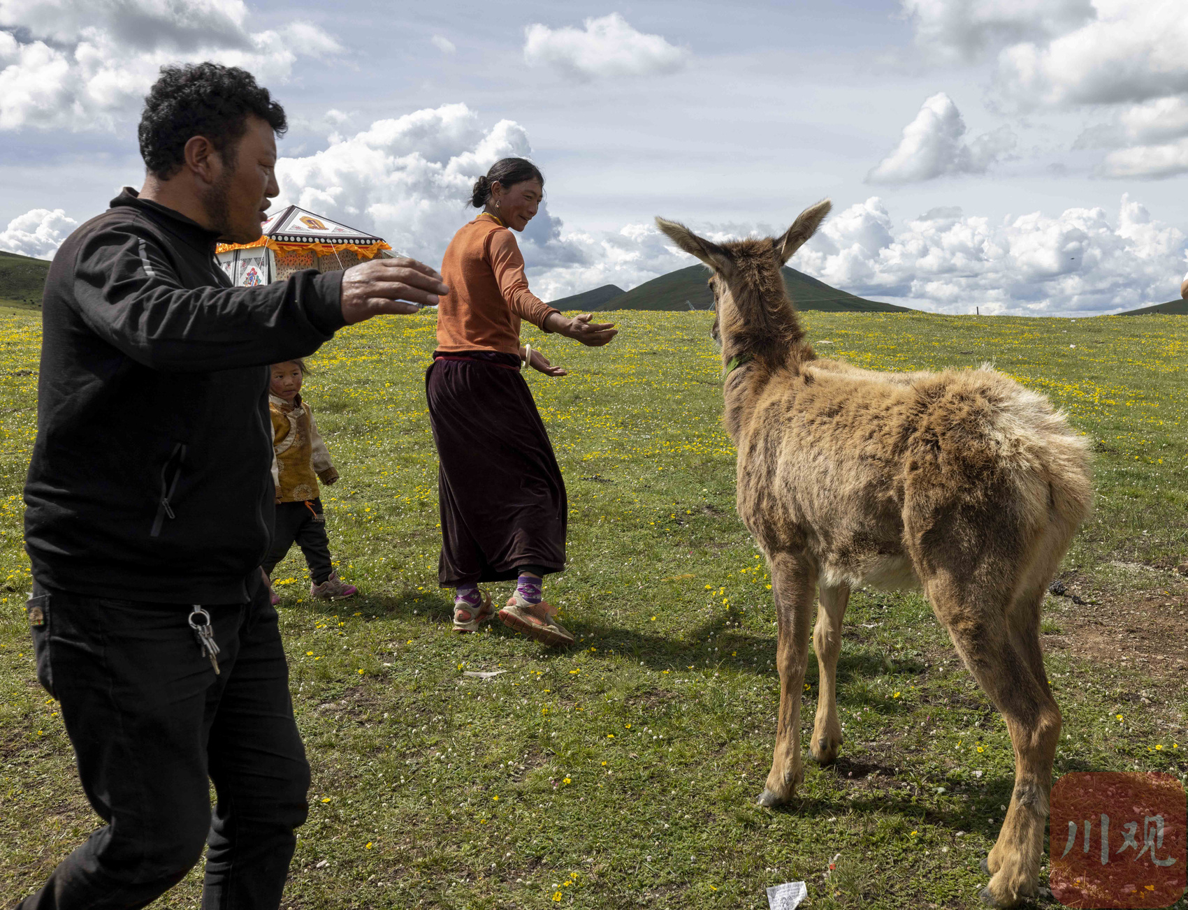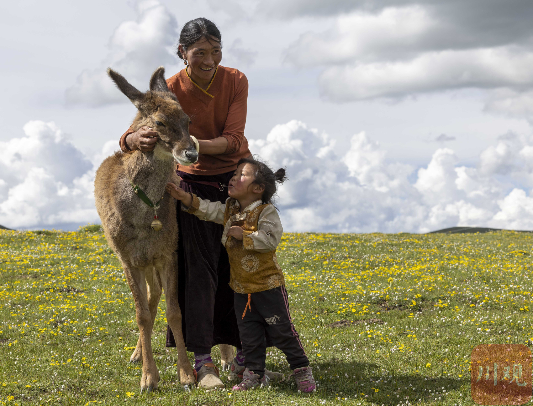 达瓦拉姆带着三岁的儿子白马仁真和小鹿一起散步。