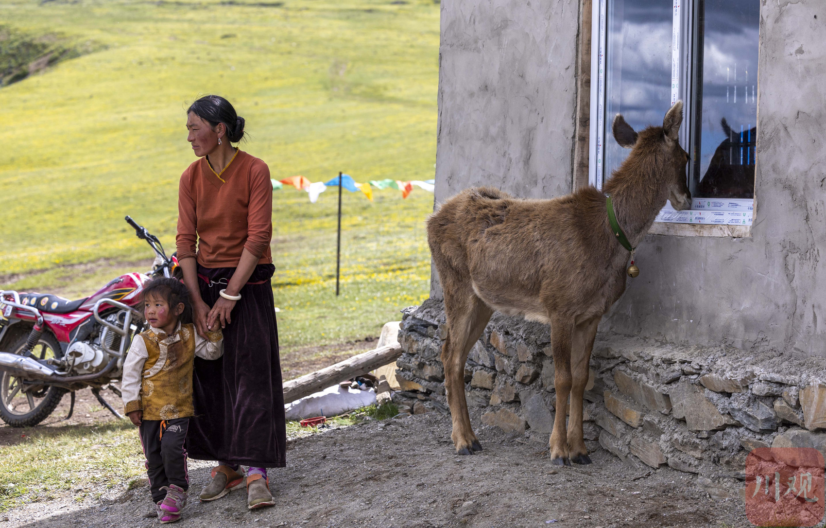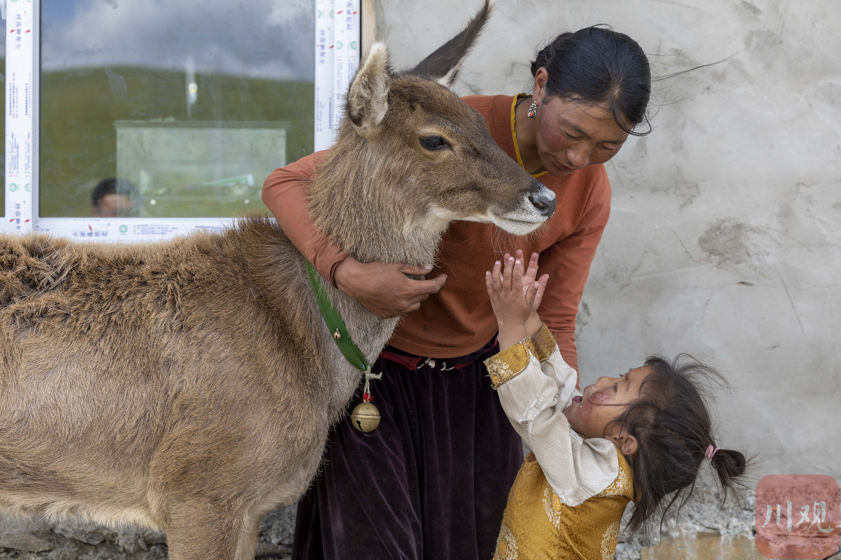 2022年7月14日,在海拔4450米的甘孜州白玉县安孜乡门马一村高原牧场,一只国家二级保护动物白唇鹿跟随牧民达瓦拉姆家的牦牛群,悠闲地在草场上觅食青草,吃饱喝足后的小鹿一路飞奔到牧民定居点的达瓦拉姆家门口,呦呦叫着把头在达瓦拉姆怀里蹭来蹭去卖萌。