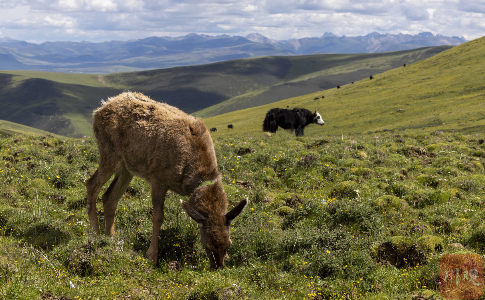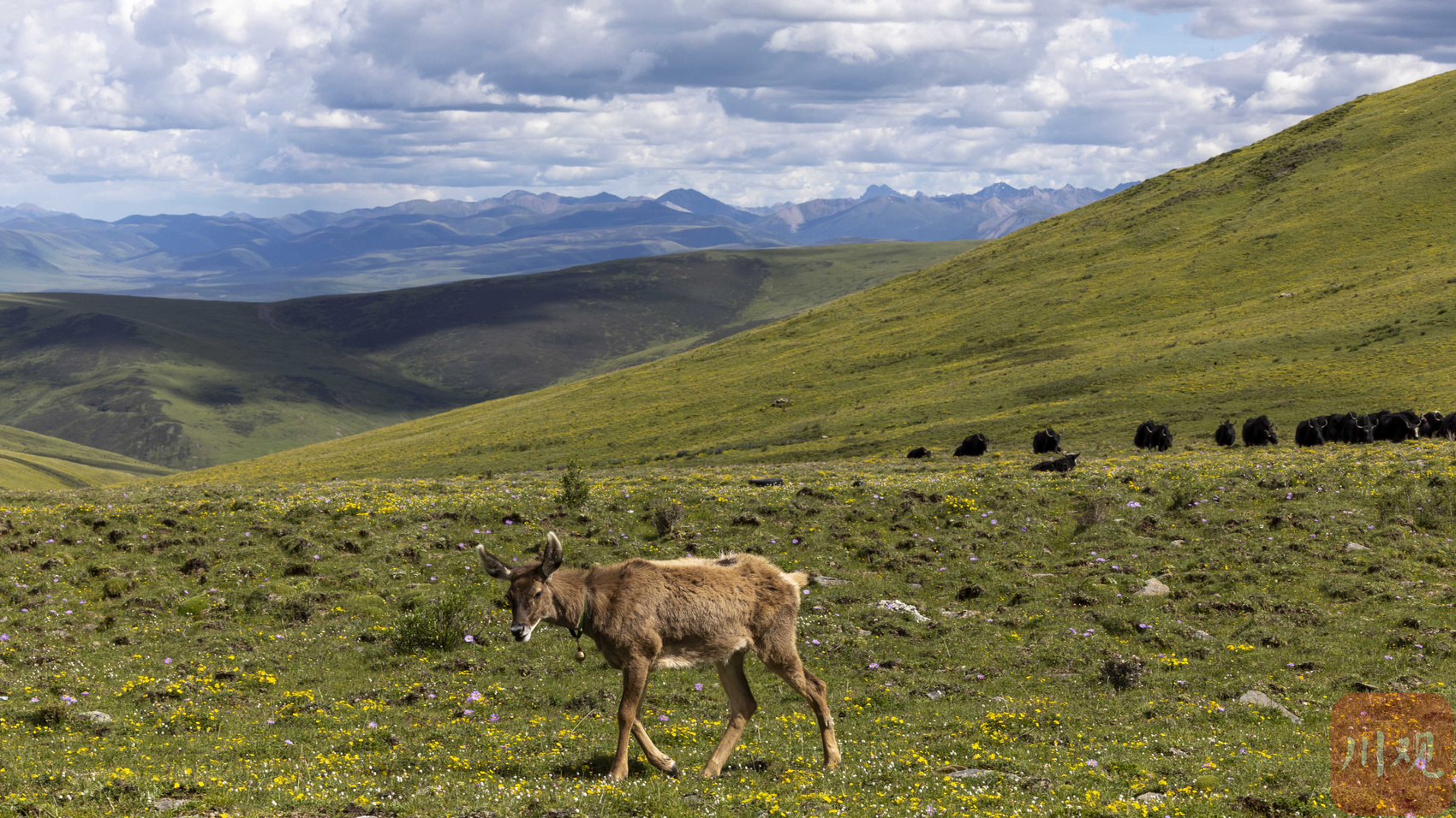 2022年7月14日,在海拔4450米的甘孜州白玉县安孜乡门马一村高原牧场,一只国家二级保护动物白唇鹿跟随牧民达瓦拉姆家的牦牛群,悠闲地在草场上觅食青草。