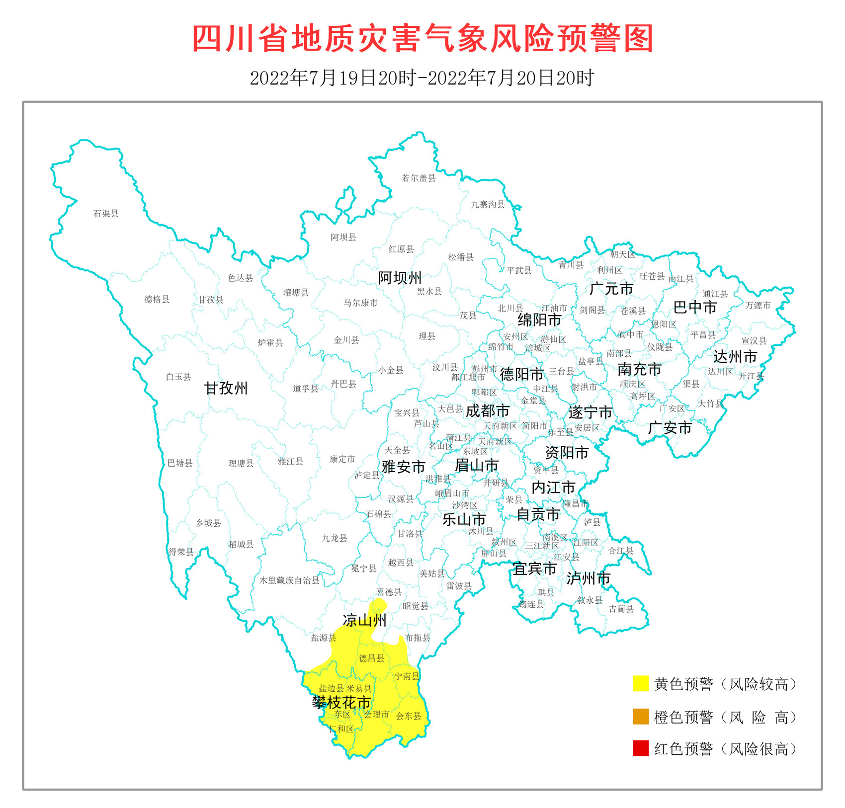 7月19日,根据四川省地质环境条件,结合四川省气象台天气预报情况,四川省地质灾害指挥部办公室发布全省地质灾害气象风险黄色预警,涉及2市(州)14个县(市、区)。