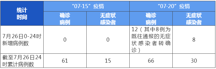 “07·15”疫情无新增本土确诊病例,无新增本土无症状感染者。截至26日24时,本起疫情累计报告本土确诊病例61例,本土无症状感染者15例。