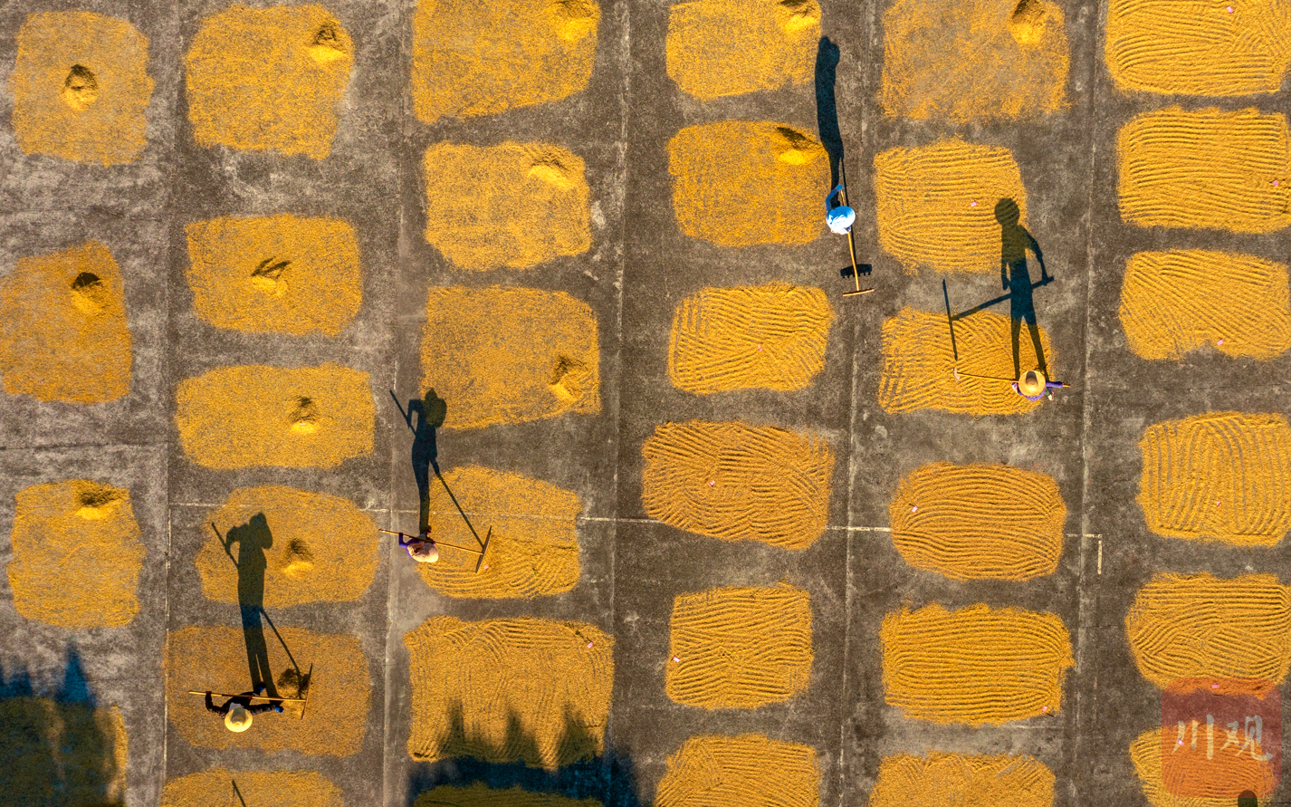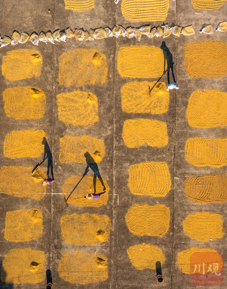 8月3日,四川省农业科学院水稻高粱研究所泸县科研基地内,工作人员正在晾晒收割下水稻新材料。基地的院坝中,一个一个的小方块整齐排列,每一个小方块就是今年新水稻新材料。进入8月,基地内的水稻材料依次成熟,有超过2万份水稻新材料都要这样晾晒后装袋入库,进入下一步的秋繁科研阶段。