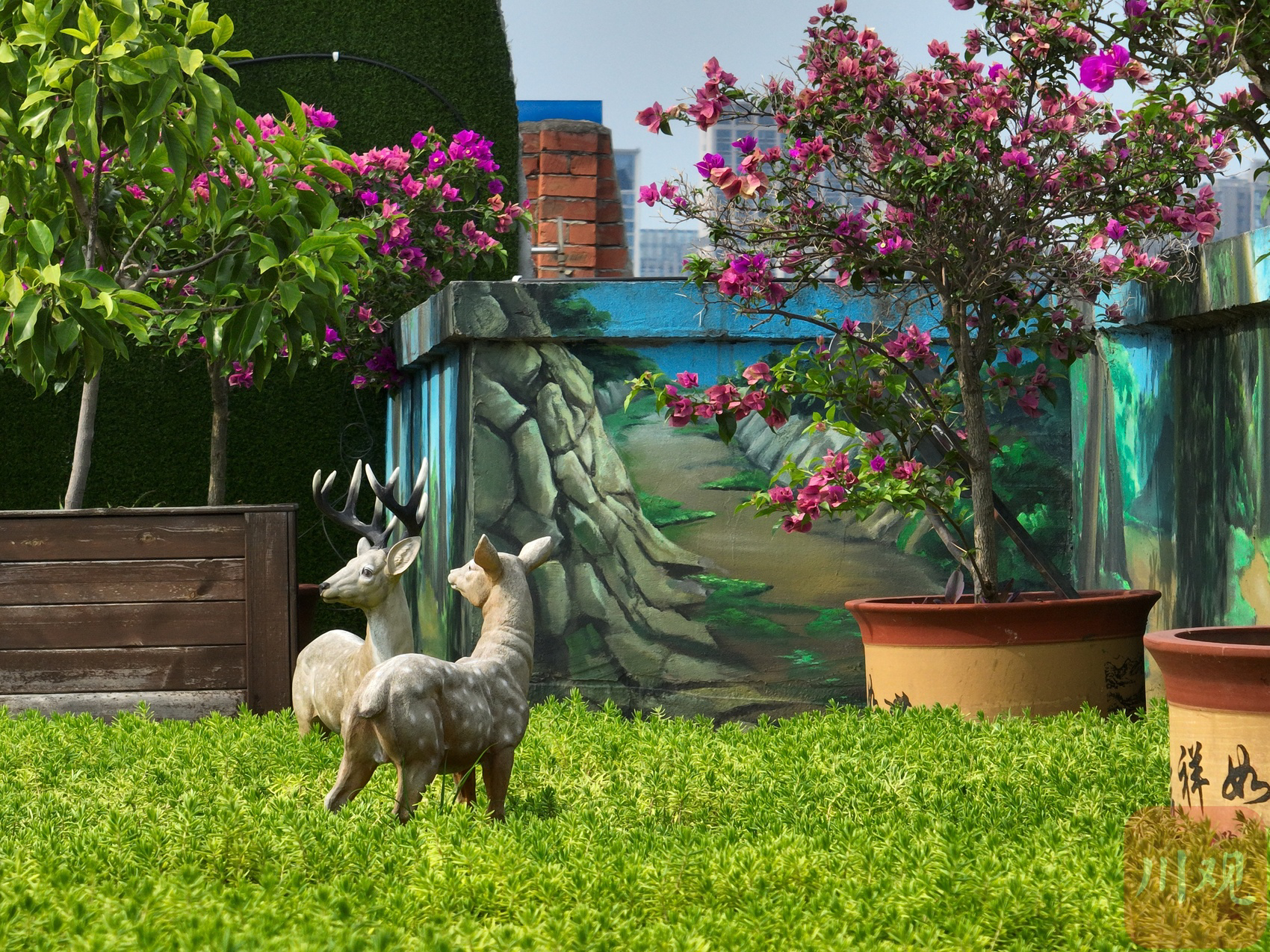 栩栩如生的动物雕塑和居民自发手绘的背景墙组成的花园一角