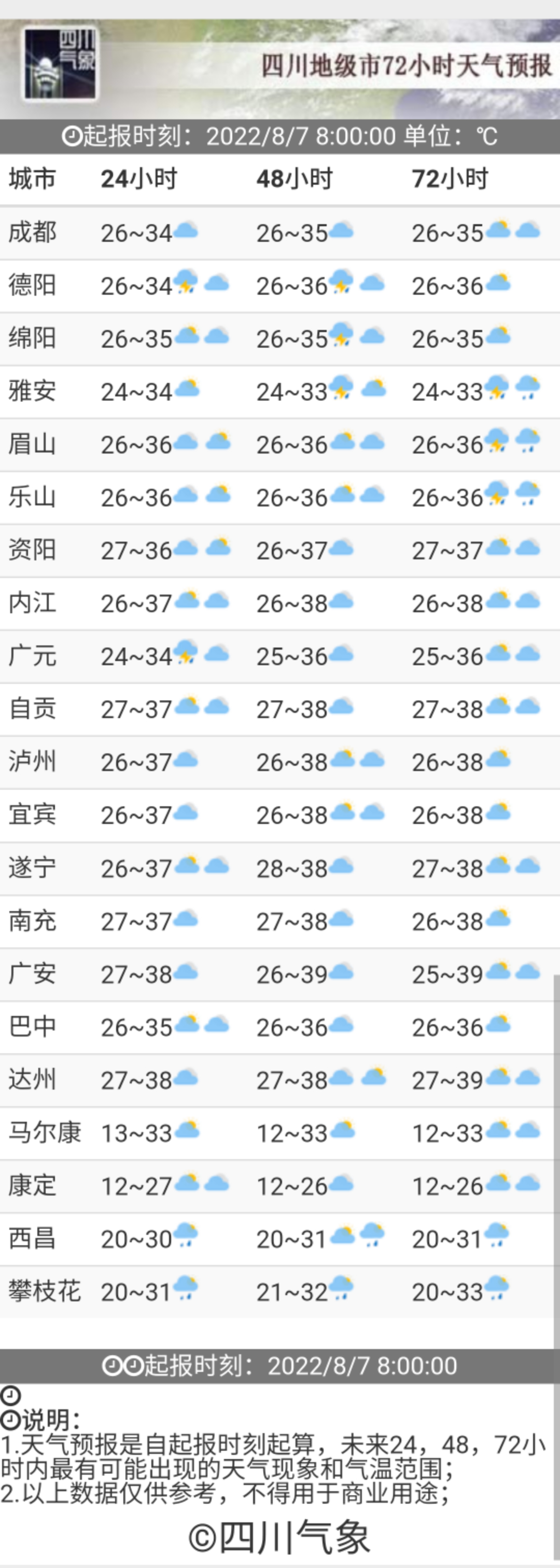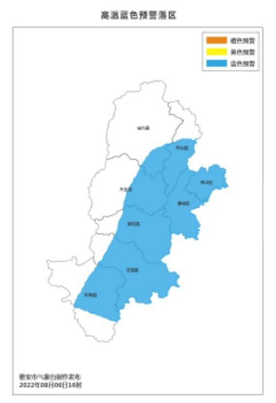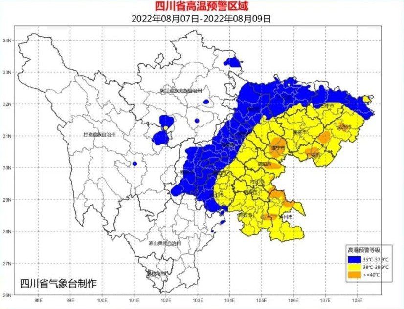 ▲ 成都市气象台2022年08月06日16时00分发布高温蓝色预警:预计从7日开始,成都市所有县(市、区)将出现5天左右的持续性高温天气,日最高气温将达35℃以上,东部部分地方可达37℃以上,请注意防暑降温。