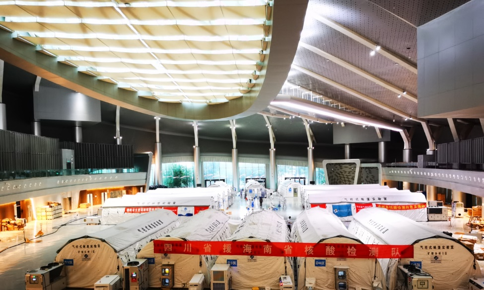 8月10日,川观新闻记者从四川省人民医院获悉,8月9日14时,四川省气膜实验室核酸应急检测队在海南儋州海花岛国际会展中心搭建的气膜方舱实验室正式投入使用。该实验室由四川省气膜实验室核酸检测应急队四川省人民医院队、西南医科大学附属医院队、川北医学院附属医院队携带的气膜方舱共同组建完成,首批进舱工作的医务人员54人来自四川省人民医院队。