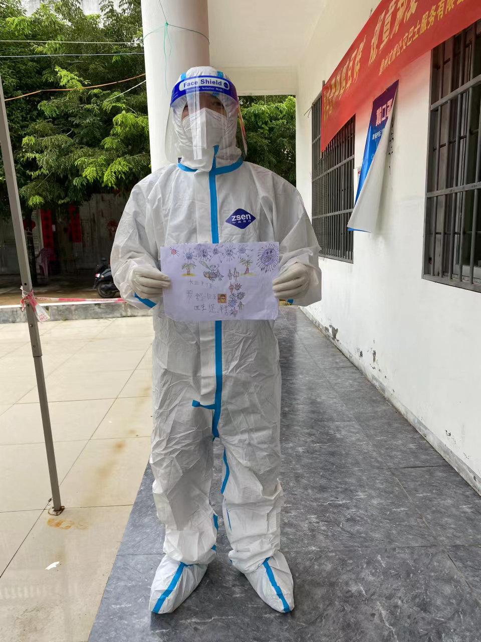 自贡市第三人民医院、重症医学科护师周方胜则记住了在海南采样时,一个小女孩送她的一幅画。这幅画上,有持剑打“病毒”的白衣勇士,还有小女孩写下的:“医生,您辛苦了”。周方胜回复小女孩:“叔叔很高兴能来到这里和你们一起打怪兽。”