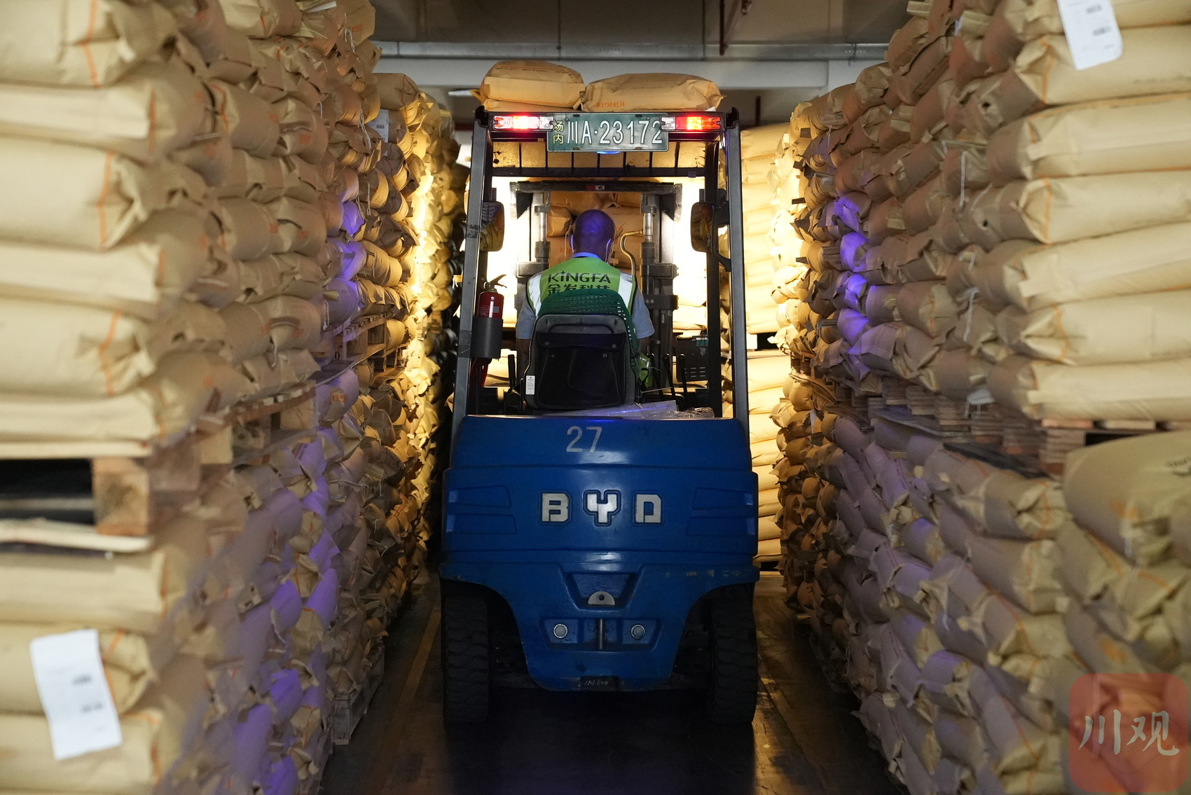 满满当当的货品存放仓库中,一辆叉车正在作业,转运货品