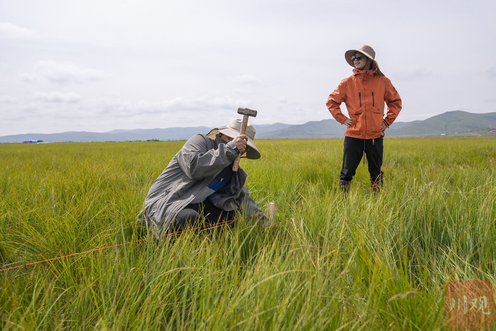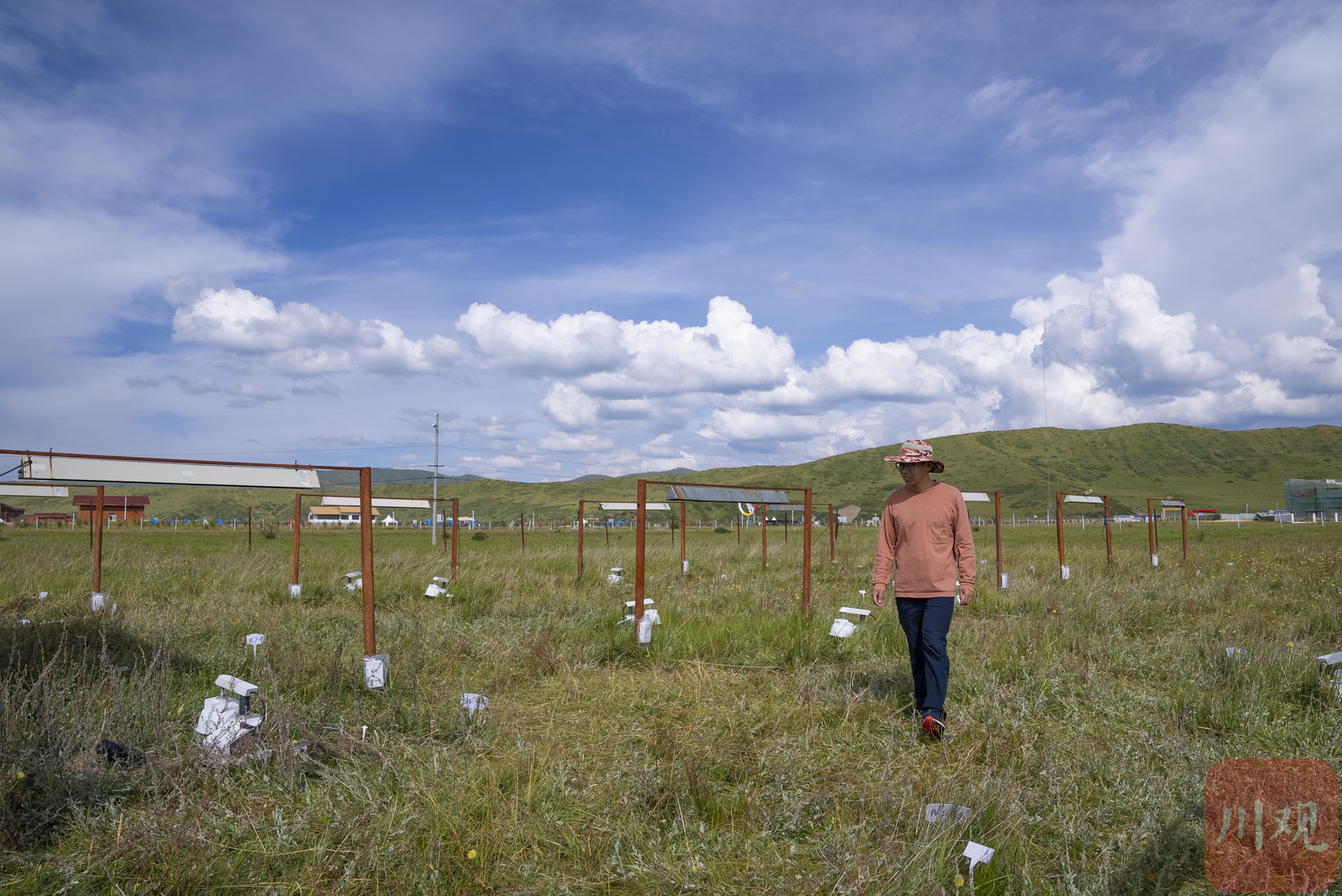 在海拔3600多米的阿坝藏族羌族自治州红原县瓦切镇北部,“红军过草地纪念碑”屹立在日干乔大沼泽。远远望去,空旷无垠的沼泽地,青草和蓝天自成一体,若尔盖站综合观测场的设施隐约可见。若尔盖站站长助理胡健,正带着技术人员在规划观测样地。