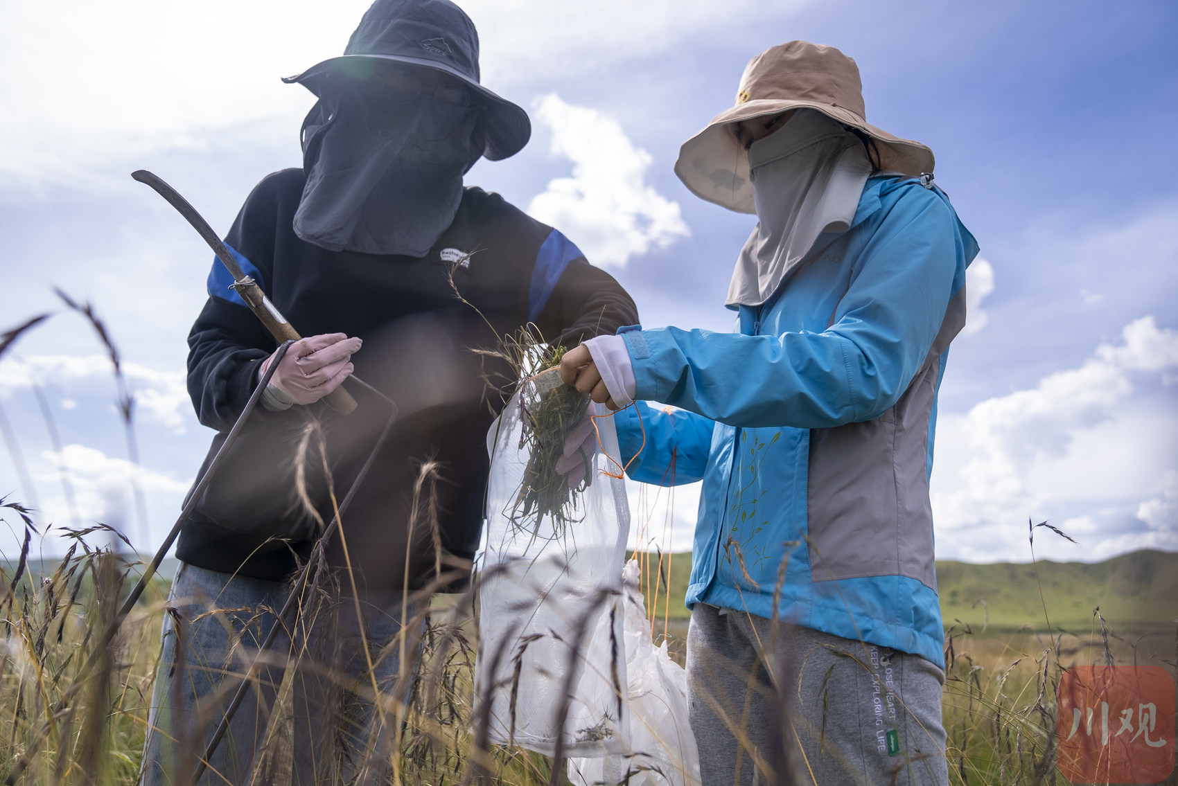 团队的研究生们正在采集样本,开展牧草种质资源评价工作。老芒麦等牧草生物量大、营养丰富,在这里长势好,拉直起来超过1.3米。取样时,用样方框放在牧草根部,统计样方框中的枝条数量,了解其分蘖能力。取样后,放入烘箱中烘干,称重以测定其干草产量。此外,他们还要重点关注各牧草资源的叶茎比、穗长、株高、种子产量等形态特征和生产性能。