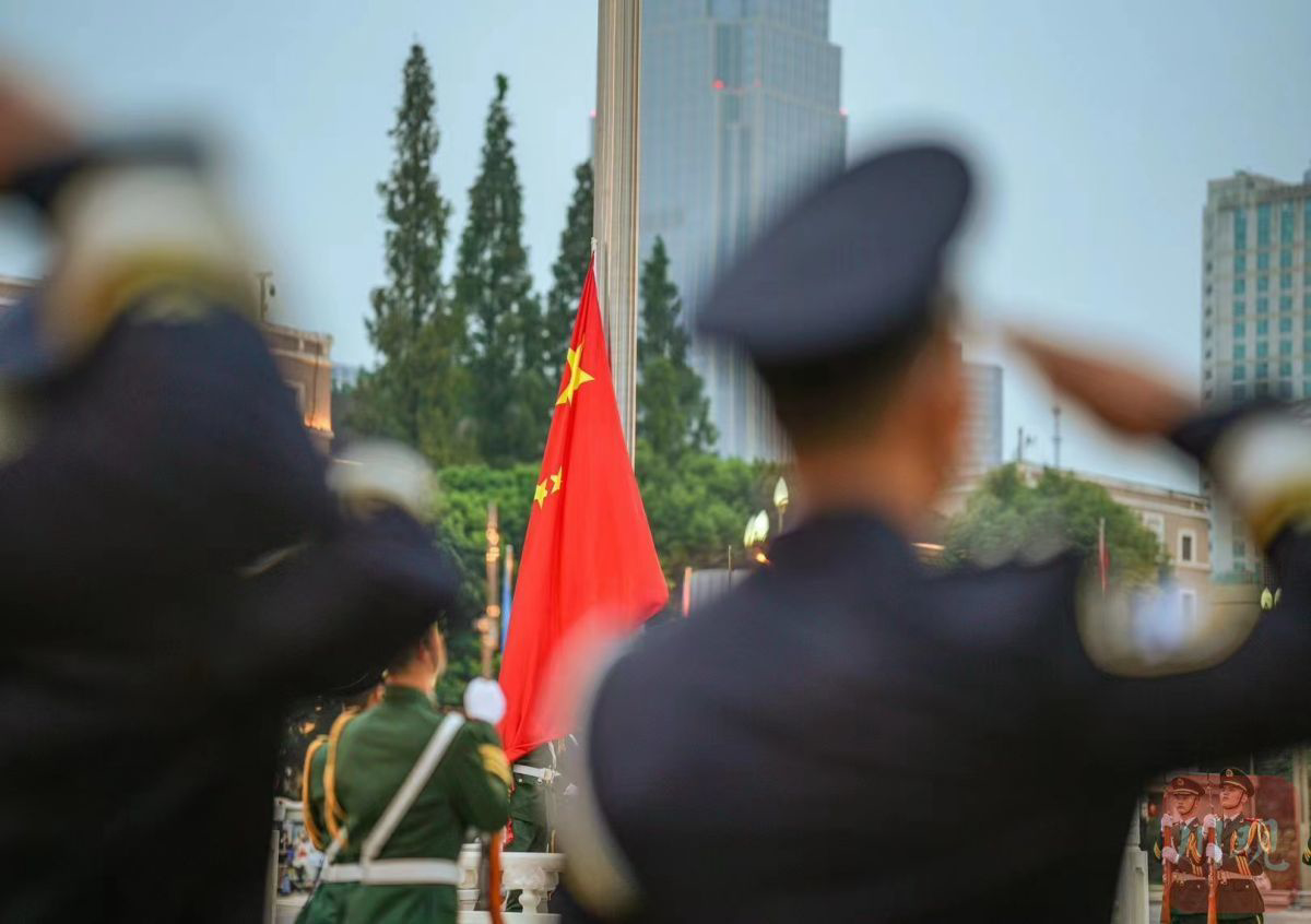 “敬礼!”6点59分,国旗护卫队领队口号声响起,护旗队员行举枪礼,升旗手将国旗的一角高高抛起。
