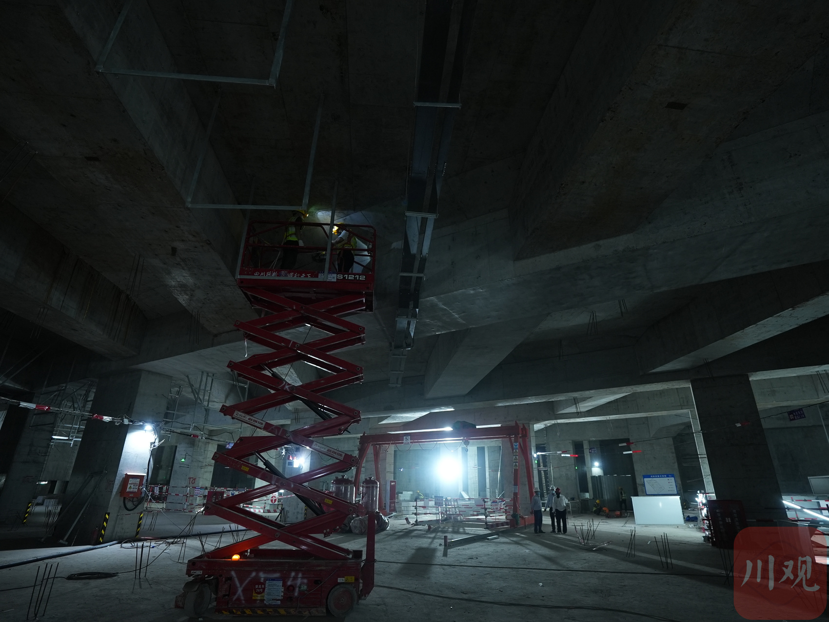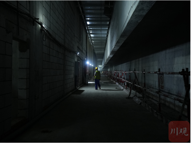 在蜀道集团四川路桥铁建公司项目副总工程师文状的带领下,川观新闻记者来到位于地下的工地现场。密闭空间内,满布着工程照明灯,由于在室内,施工声引起了巨大回响,得大声说话才能听清。