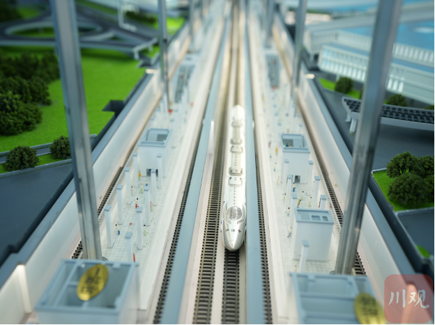 位于成都天府国际机场综合换乘中心地下二层的成自高铁模型图。