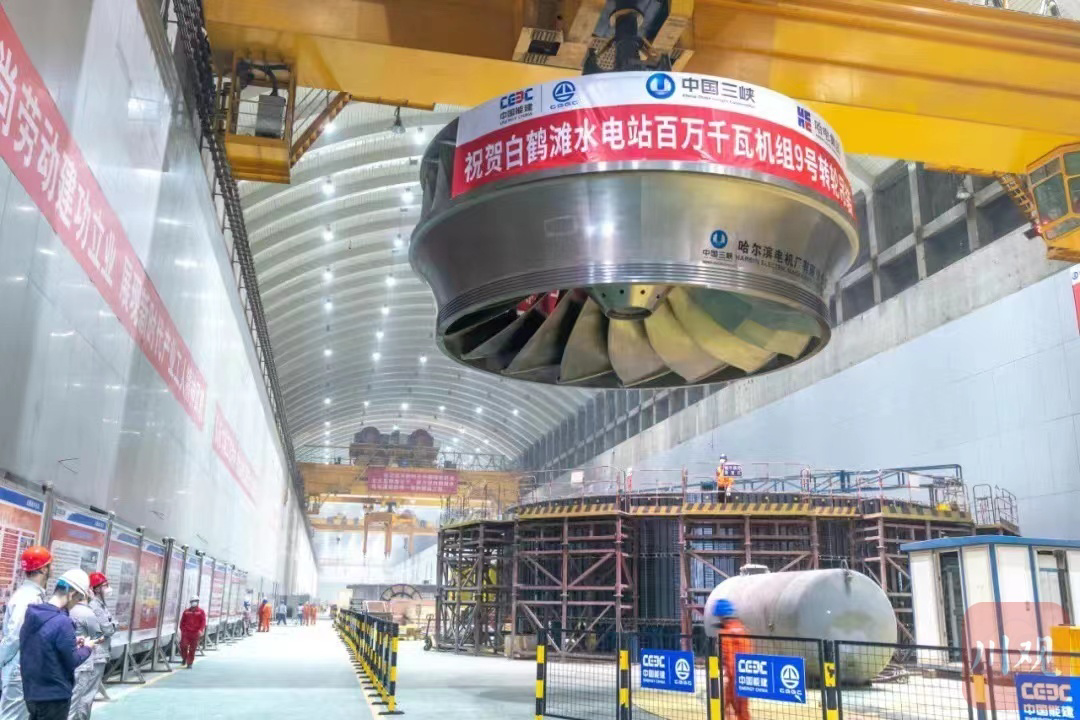 白鹤滩水电站地下厂房内,工人在吊装发电机组