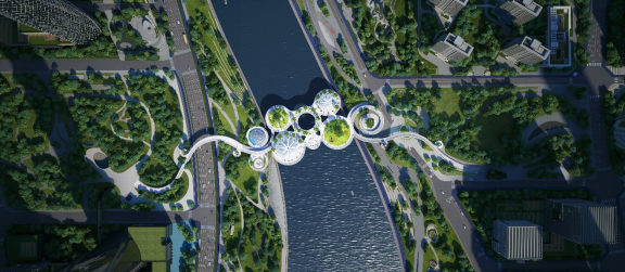 在概念图中,沿河的绿道、自行车道从桥的下方穿过。经过桥下,会给人们带来“鱼戏莲叶间”的体验。刘艺还介绍,比如夜游锦江活动,“游船上的人,从桥下通过,就会感觉到像是鱼儿一样从莲叶中穿行”。