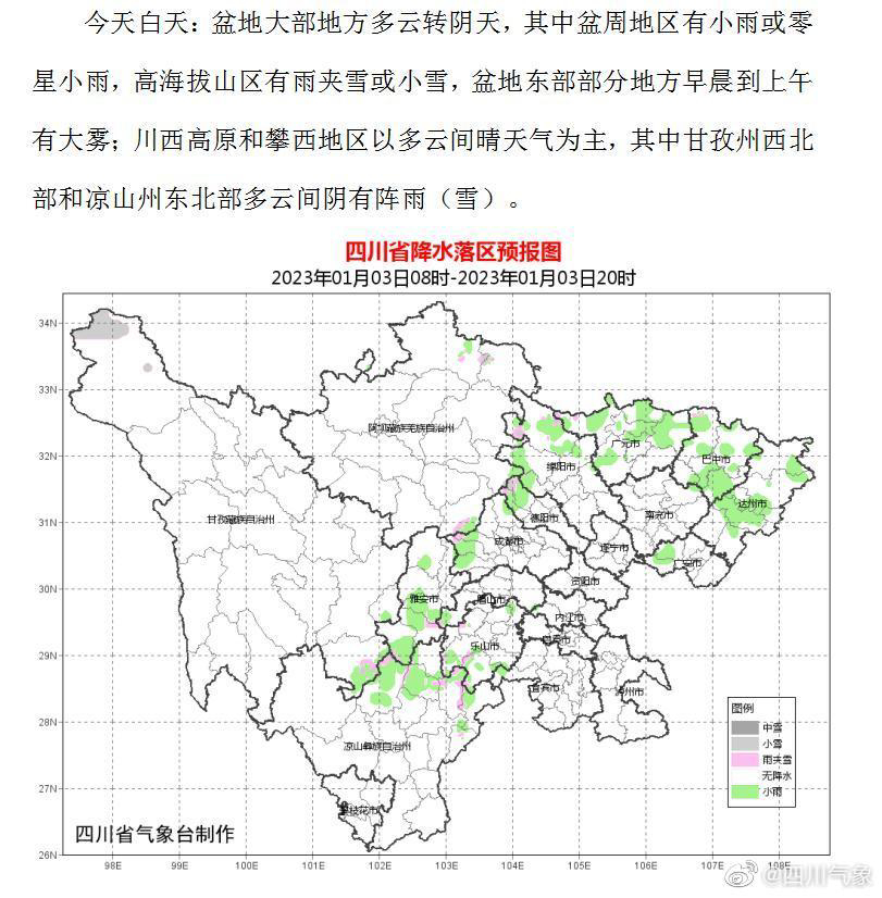 @四川气象 说,今天白天到晚上:盆地大部地方多云转小雨或零星小雨,高海拔山区有雨夹雪或小雪,盆地东部部分地方早晨到上午有大雾;川西高原和攀西地区以多云间晴天气为主,其中甘孜州西北部和凉山州东北部多云间阴有阵雨(雪)。24小时内,盆地最低气温:西北部1~4℃,其余地方5~7℃;最高气温:9~11℃。