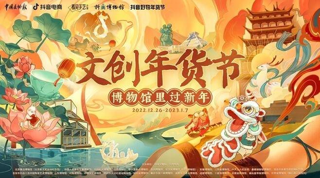 2022年12月26日至2023年1月7日,中国文物报社、抖音电商携手全国25家博物馆,联合举办首届“文创年货节·博物馆里过新年”活动,打造一系列短视频和直播内容,展示博物馆的珍藏文物,科普文博知识;通过抖音商城等电商货架功能,推介博物馆文创精品。