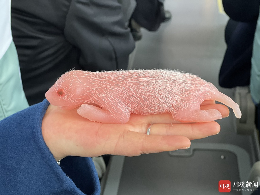 侯蓉:这是一个仿真的模型,它上面的毛是一根一根粘上去的,它和新生大熊猫的样子、大小都做得很像。这个模型和大家熟悉的大熊猫的形象相比其实差异很大,也可以直观地感受到养育大熊猫幼崽是多么的不容易。