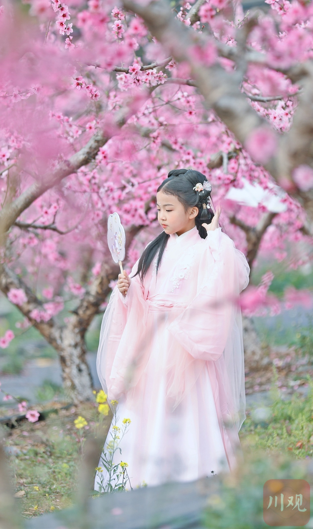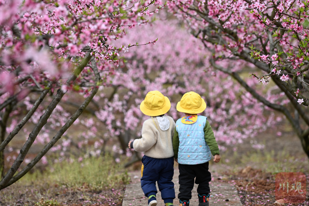 3月18日,小朋友在南充市蓬安县相如街道油房沟社区桃花园里游玩。