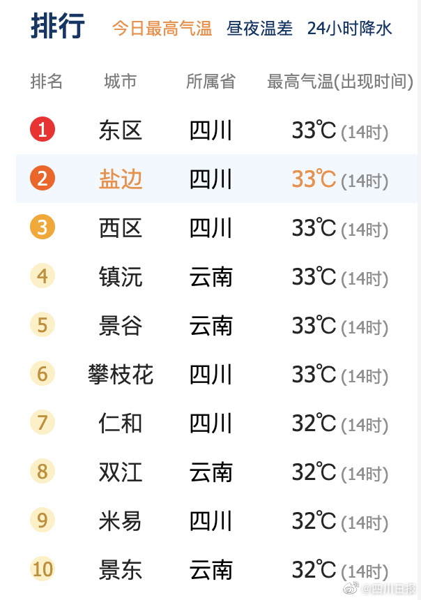 24小时内,盆地最高气温:23~25℃;最低气温:13~15℃。