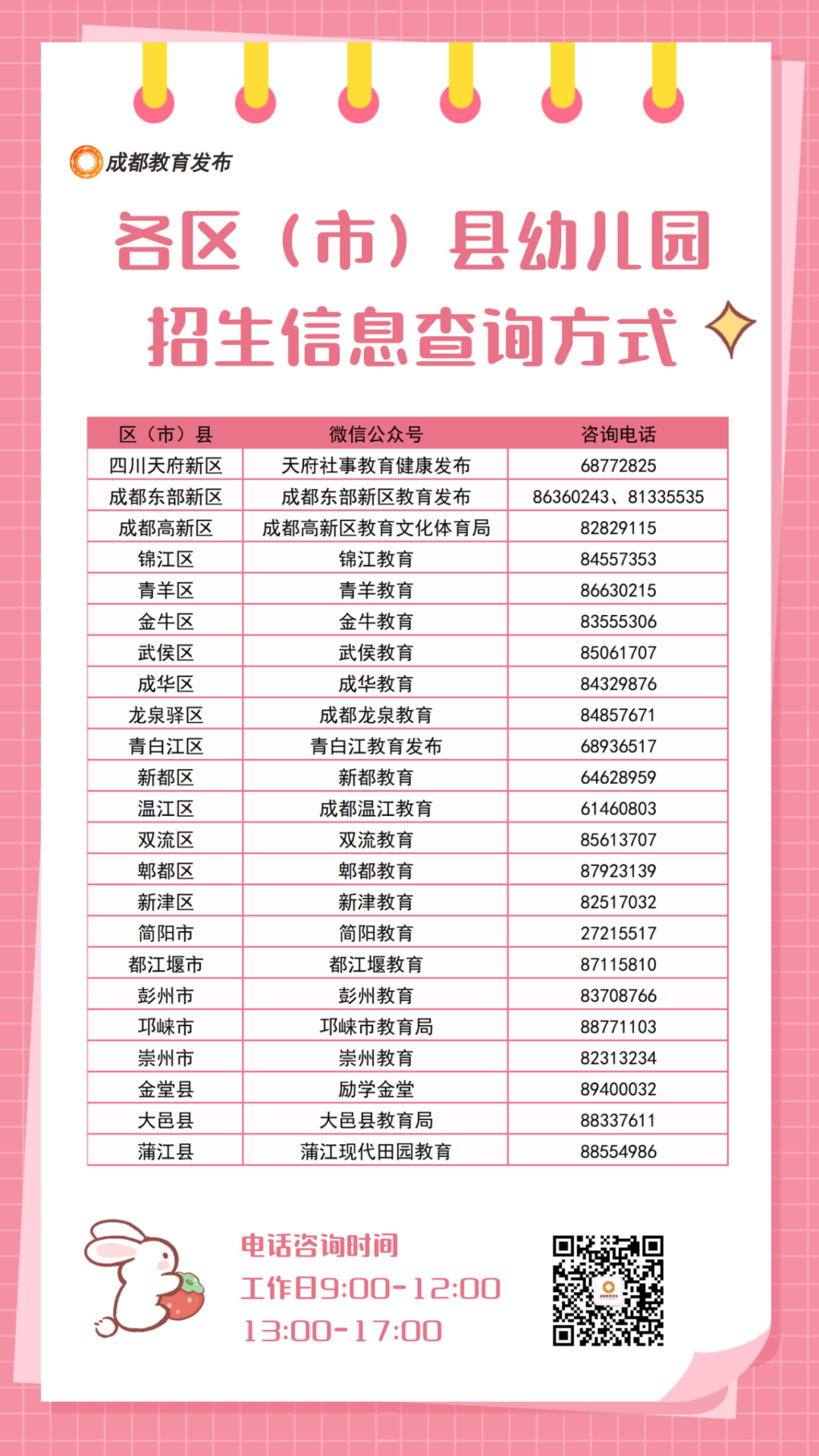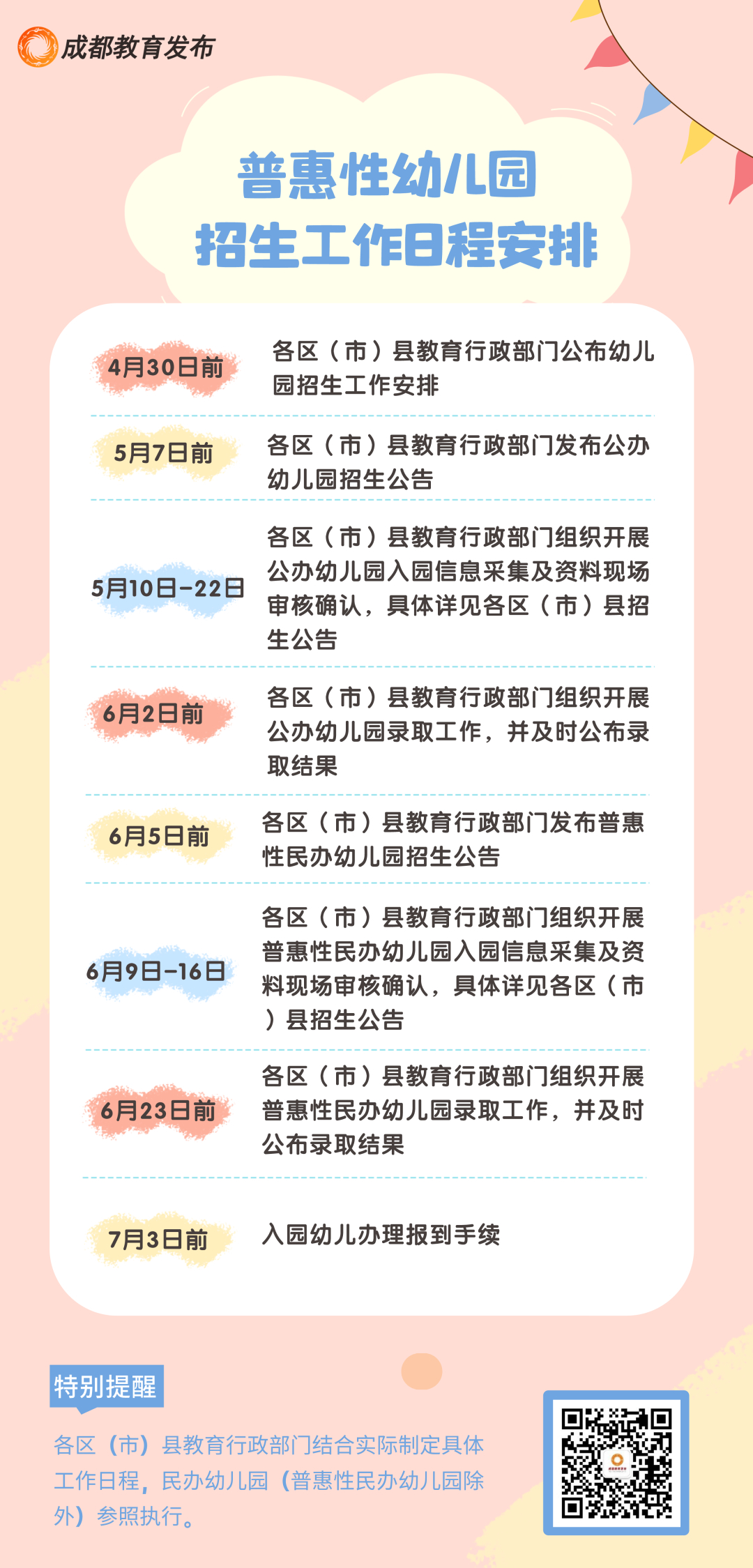 日前,成都市教育局发布了2023年幼儿园招生入园工作安排。如何报名?招生公告多久出?幼儿入园需缴纳哪些费用?成都市教育局整理了10个招生入园问题热点问答,以及招生工作日程安排时间表、各区(市)县教育行政部门电话,欢迎转发给有需要的家长朋友。