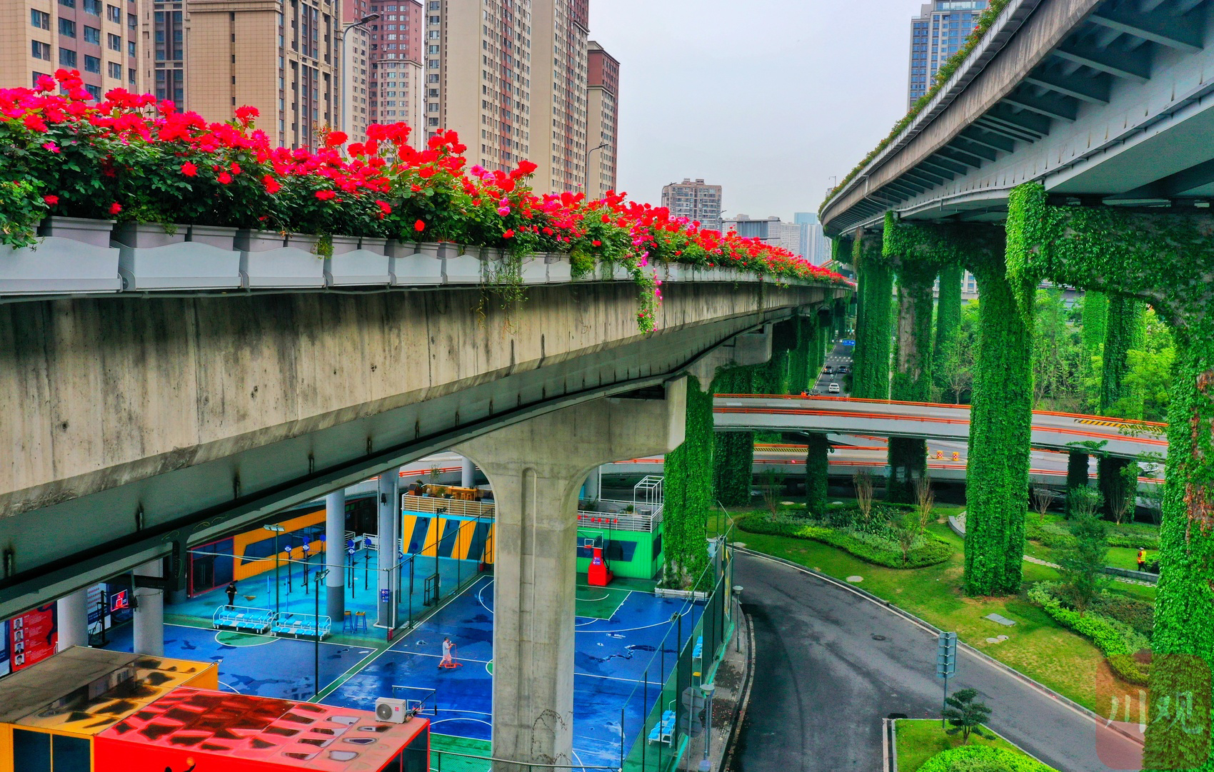 近日,成都市二环高架上盛开的月季花又火出了圈,盛开的月季花形成了绚丽多彩的“空中花带”,二环高架上的汽车仿佛行驶在立体的“空中花廊”里。
