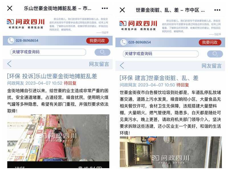 记者注意到,4月初,有网友在问政四川平台上多次向乐山市市中区人民政府投诉世豪金街夜市脏乱差的问题,但截至目前,相关部门还没有回复网友留言。