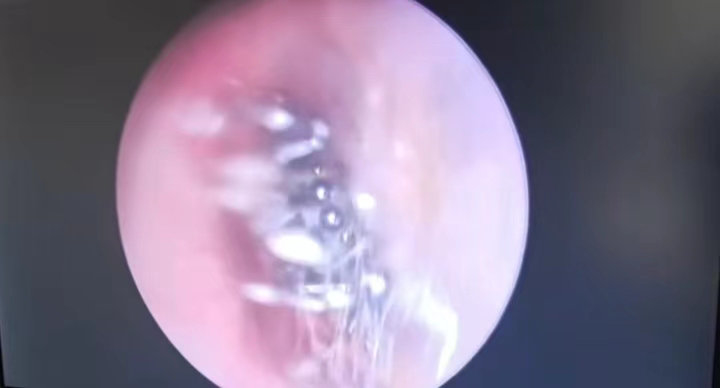 当日,该县一名40多岁阿姨因左耳耳鸣、听力下降到县人民医院眼耳鼻喉科就诊,医生用耳内镜一检查,眼前的一幕让医生感到十分惊讶。原来是患者耳朵里钻进了一只蜘蛛,在里面结网安家。