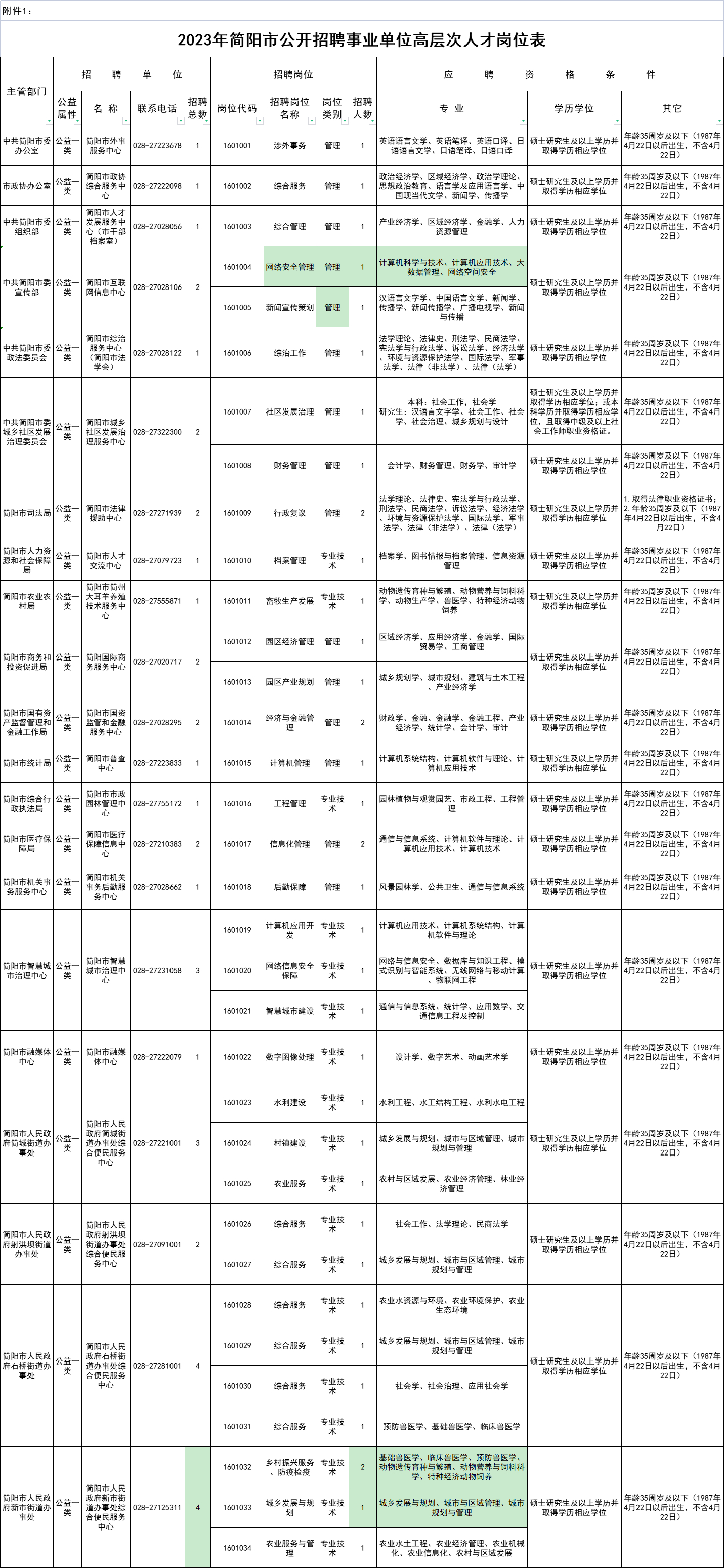 简阳市外事服务中心等21个事业单位公开招聘38名的情况见《2023年简阳市公开招聘事业单位高层次人才岗位表》或拨打招聘单位电话咨询。