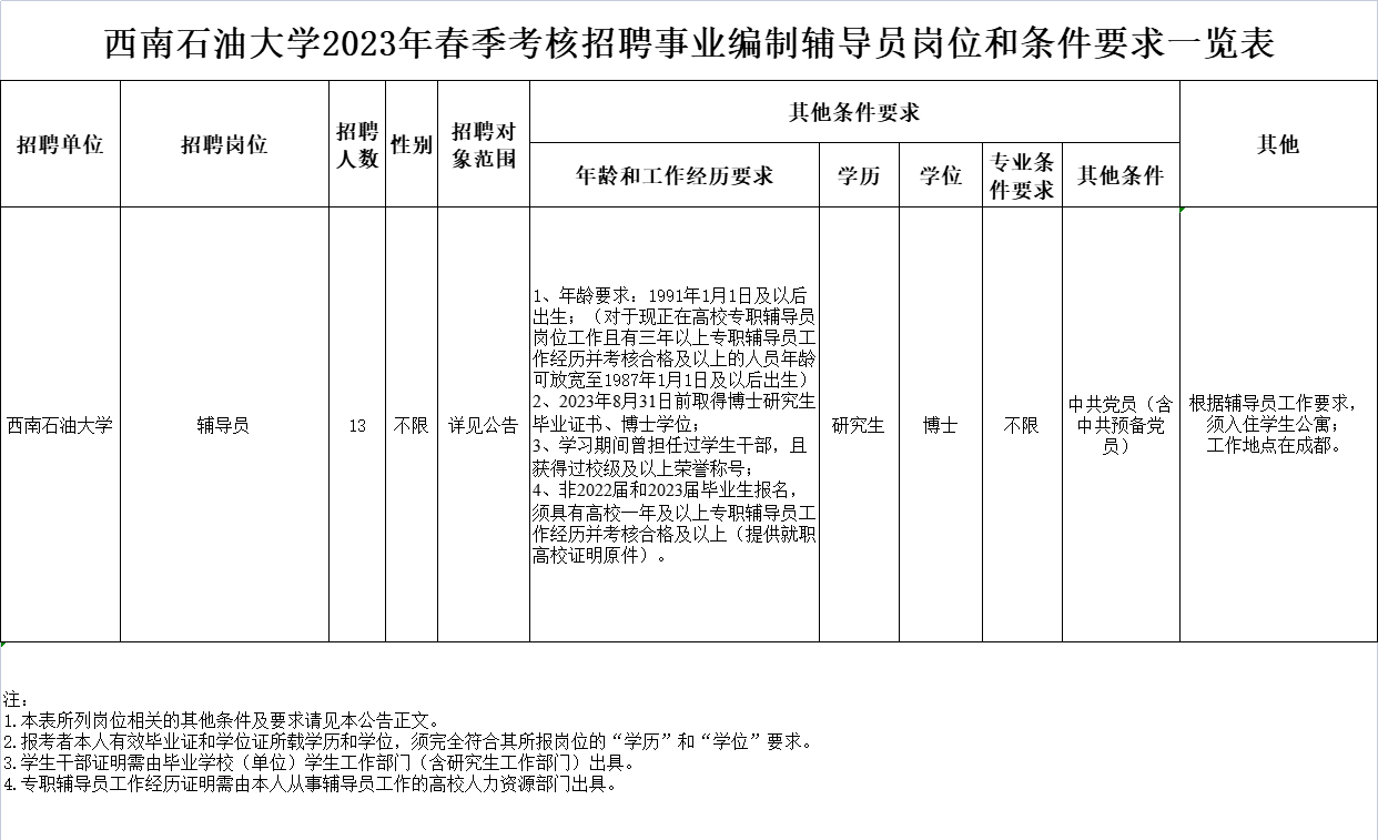 西南石油大学2023年春季考核招聘事业编制辅导员