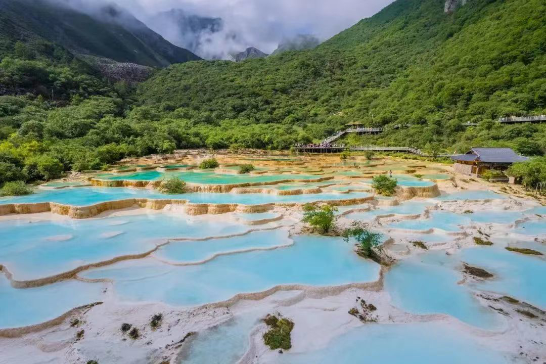 黄龙的地质结构就像一个巨大的“漏斗”。冬春枯水期时,地下水位逐渐下降,导致地面上的水体流入“漏斗”,汇入地下暗河;到了丰水期,地下河道水位开始上升,回落,水就又再次慢慢渗透出地表,显现奇幻瑰丽的景观。