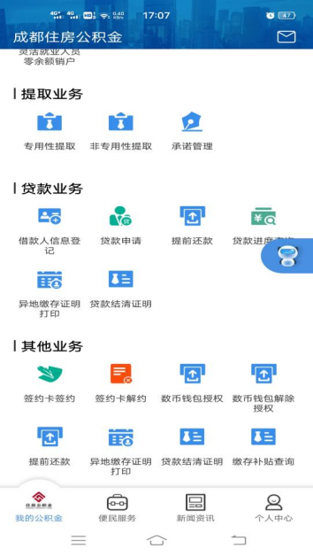 进入“成都公积金”手机APP(未开立缴存账户的职工请选择“个人业务”—“灵活就业人员开户”选项,按提示完成开户业务,并登录个人信息界面),选择“其他业务”—“数币钱包授权”交易,按相关提示完成钱包授权,界面见下图: