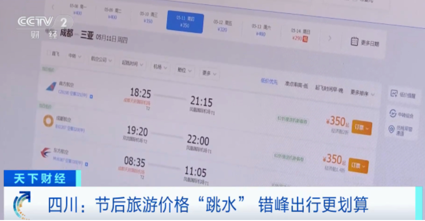 据了解,节后旅游价格“跳水”的主要原因是机票和酒店价格的下跌。记者通过某旅游平台查询到,5月5日起到本月底,成都出发到三亚机票最低价格为300元左右,成都到北京和上海的机票最低价格为500元左右。成都赴泰国、日本、韩国等国家机票价格也出现大幅下降。此外,不少目的地酒店也都恢复到了日常价格。