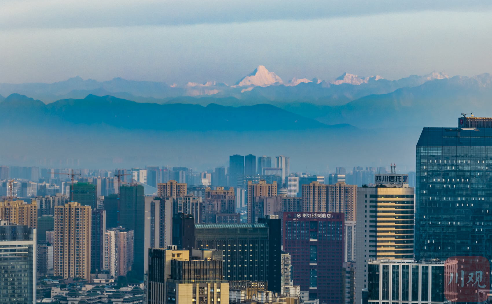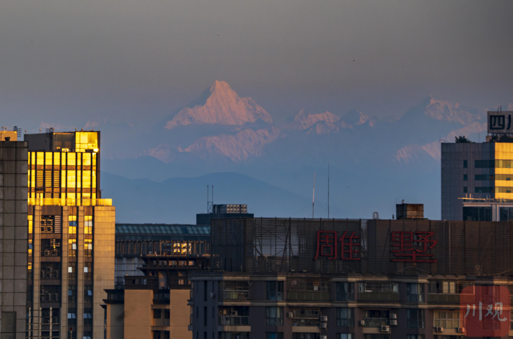 成都市区远眺幺妹峰和西岭雪山。