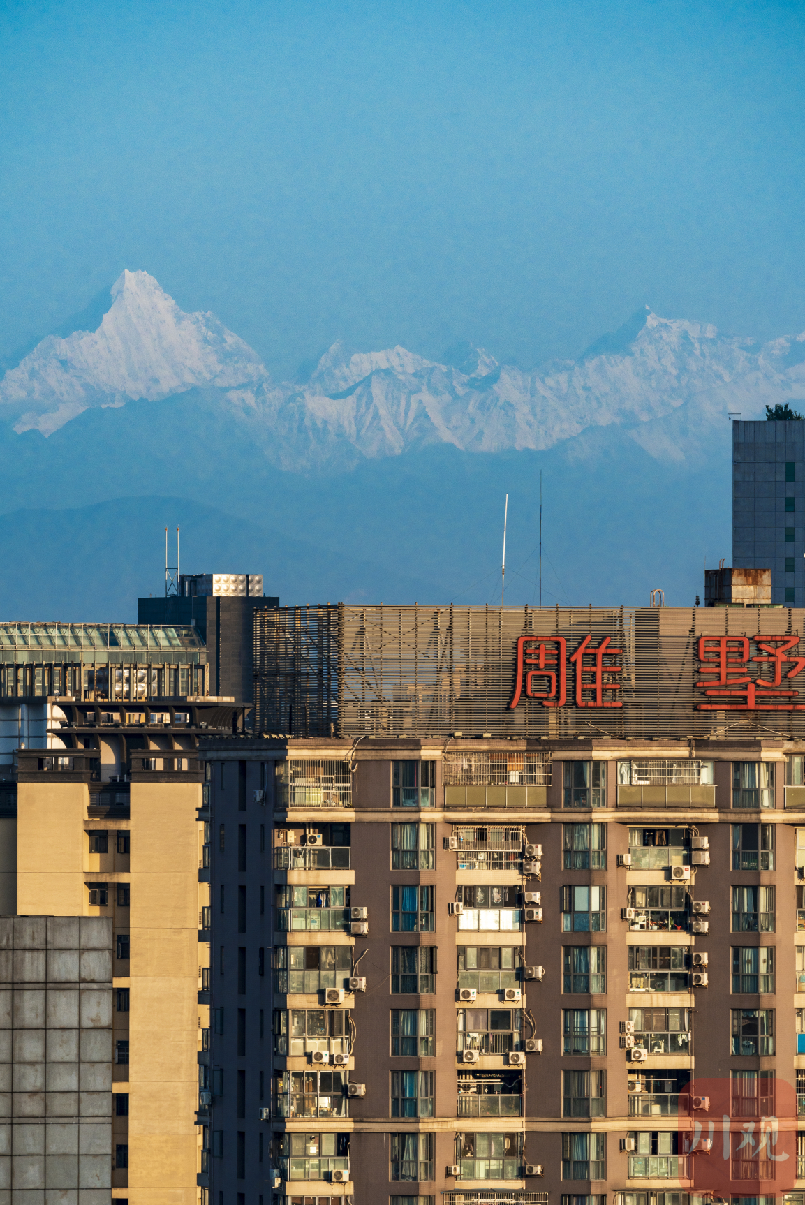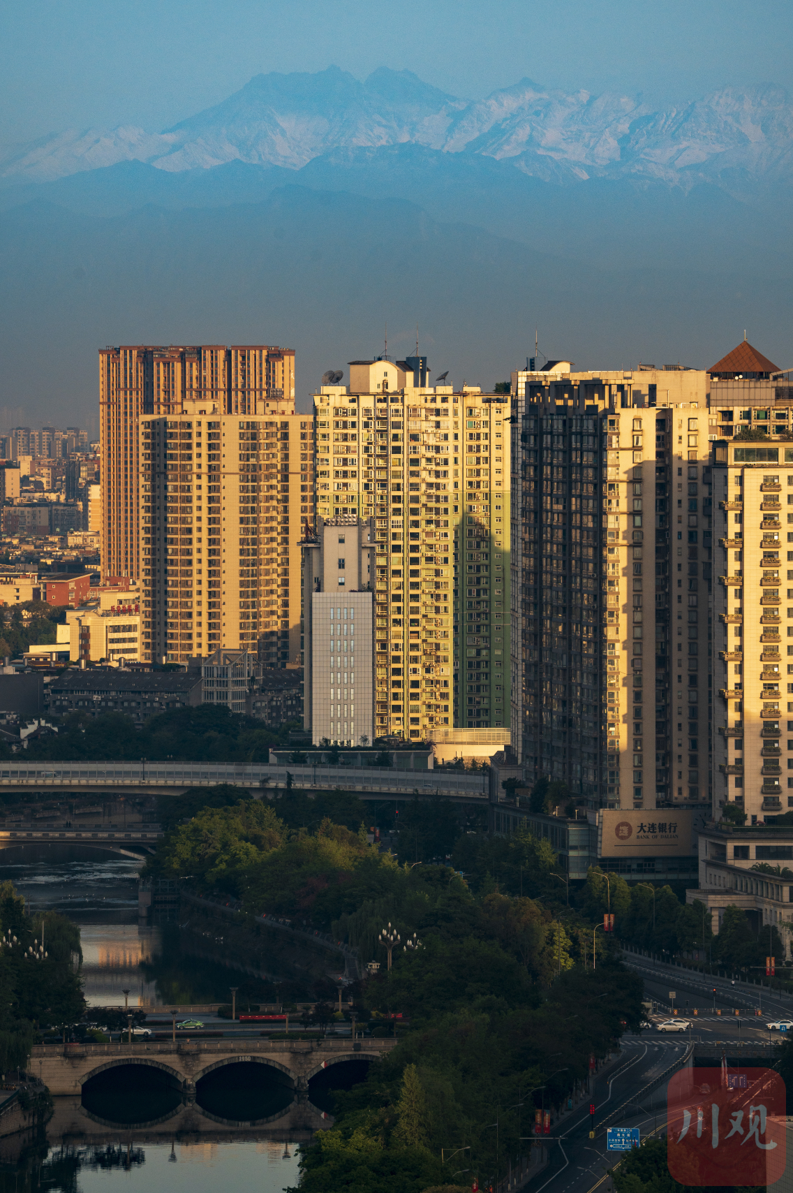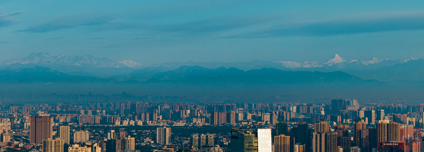 5月13日清晨,天朗气清,成都市区向西远眺,雪山在晨光的照耀下泛着金光,西岭雪山、幺妹峰清晰可见,再现了“窗含西岭千秋雪”的美景。