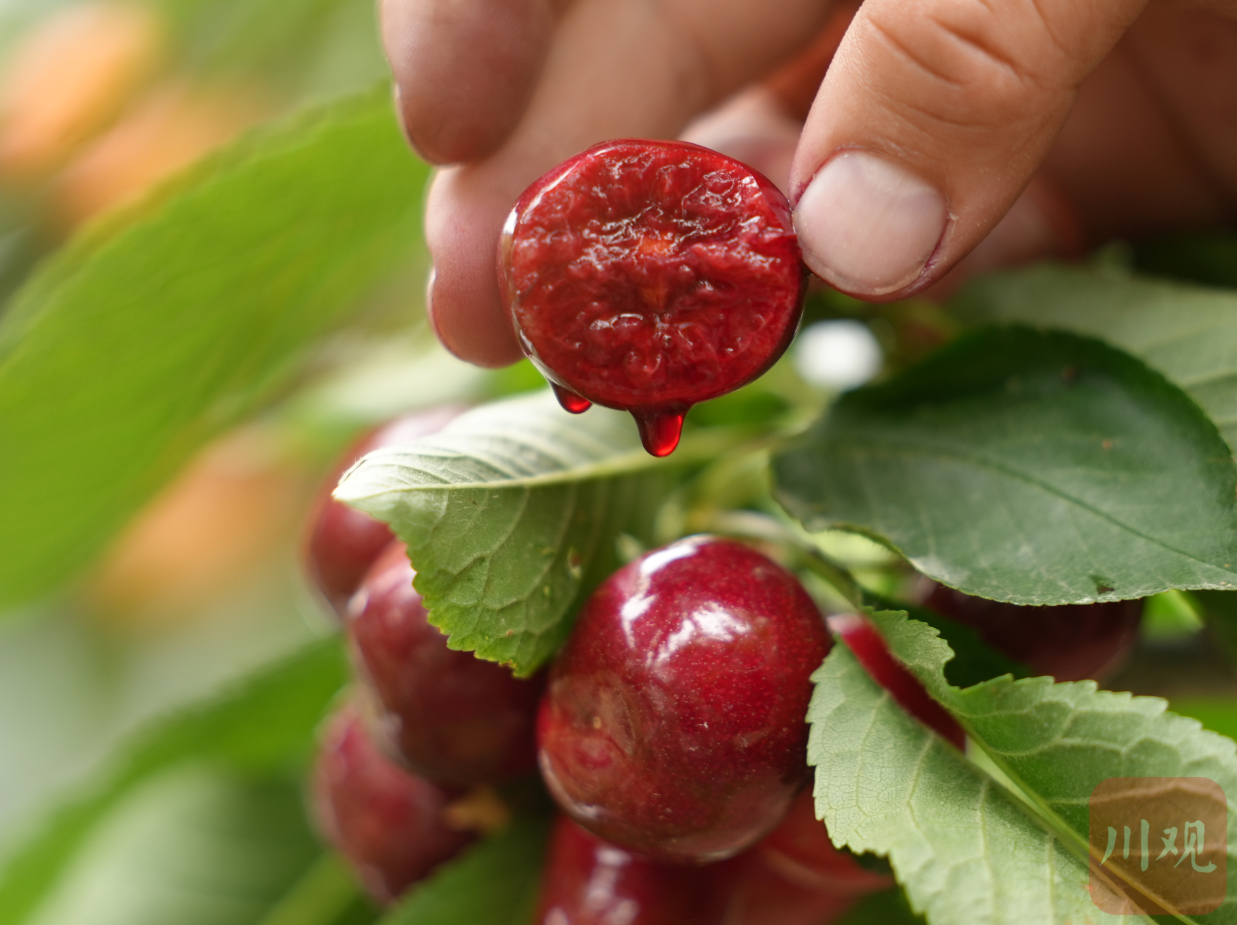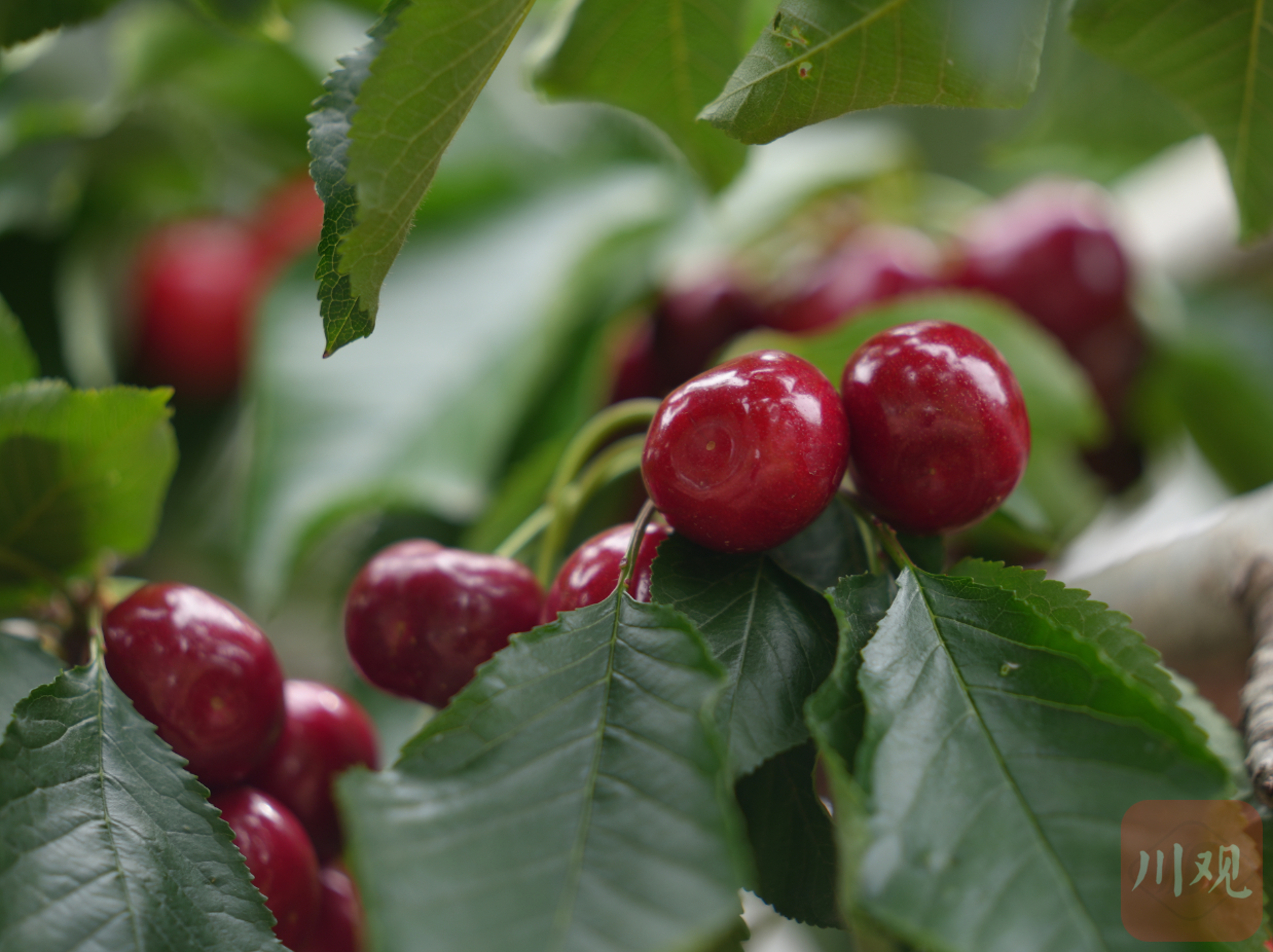 5月16日,汉源县富庄镇永兴村,空气中弥漫着香甜。果林里郁郁葱葱的枝叶之间,新鲜成熟的车厘子娇艳欲滴,密密麻麻簇拥枝头,采摘入口,清冽甘甜,沁人心脾。