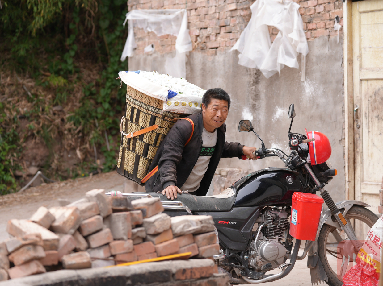 一位果农准备骑摩托车到场镇上把一背篓的车厘子卖掉。